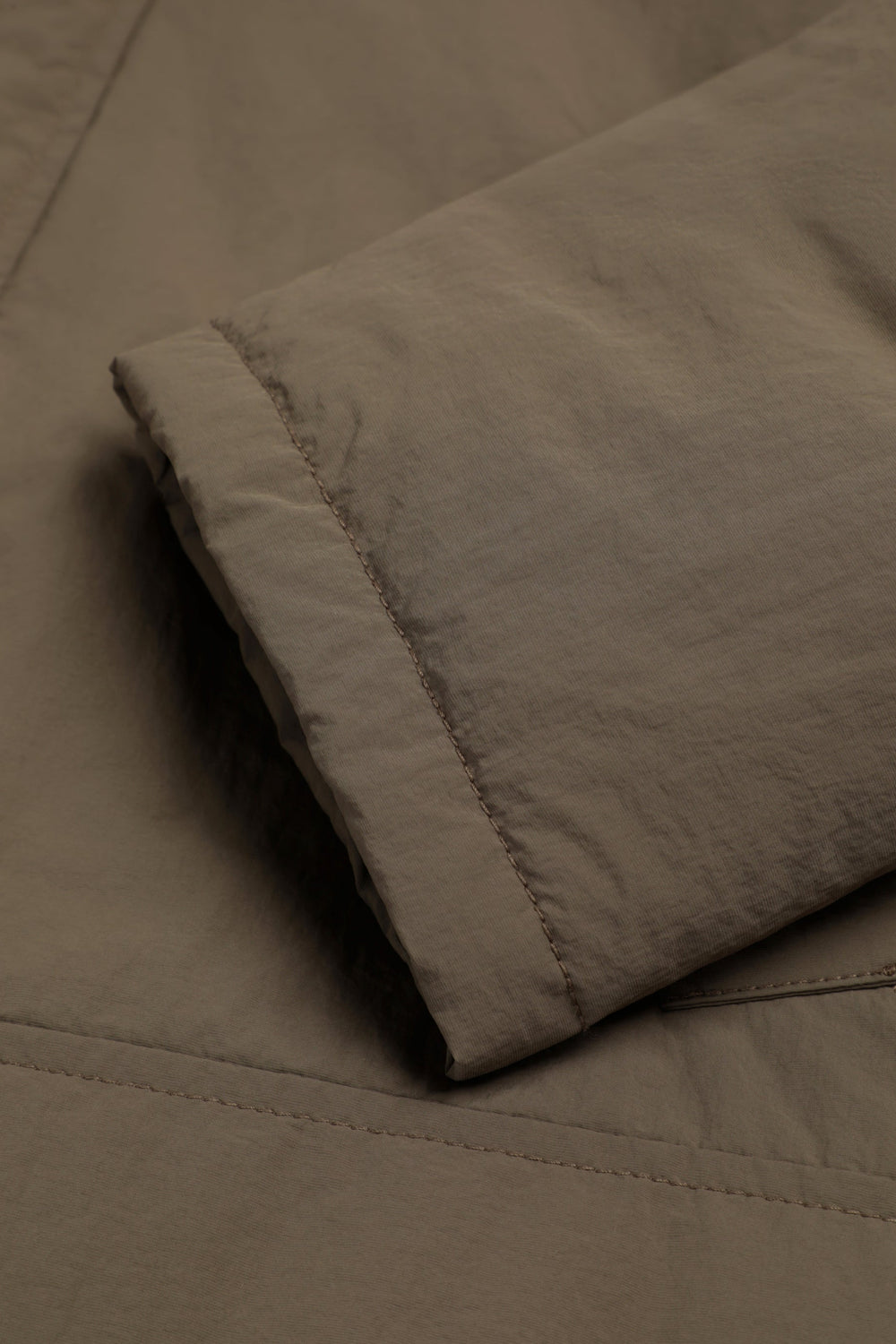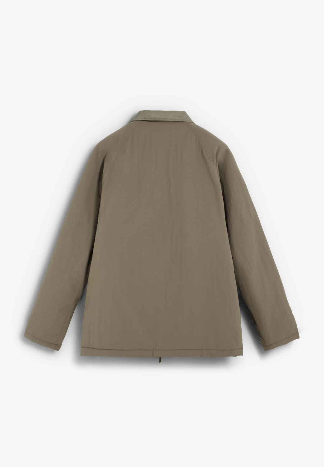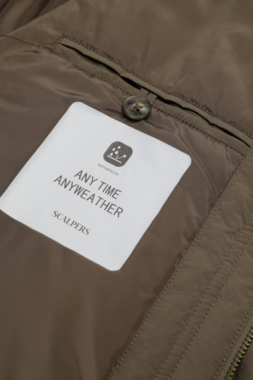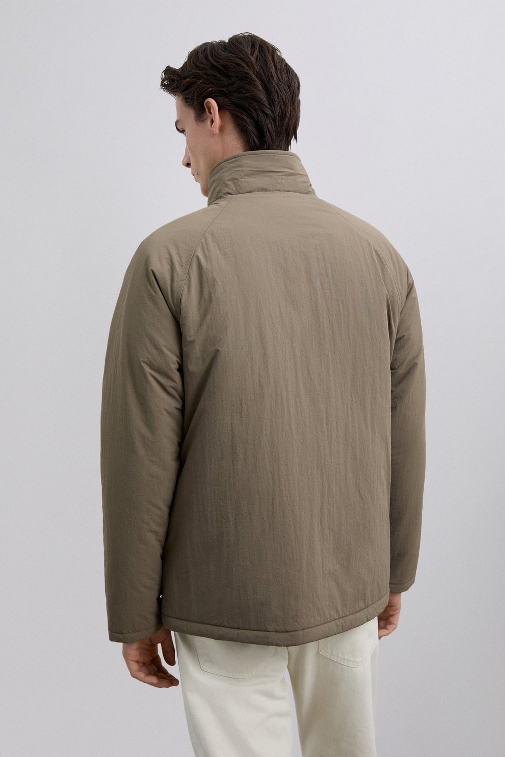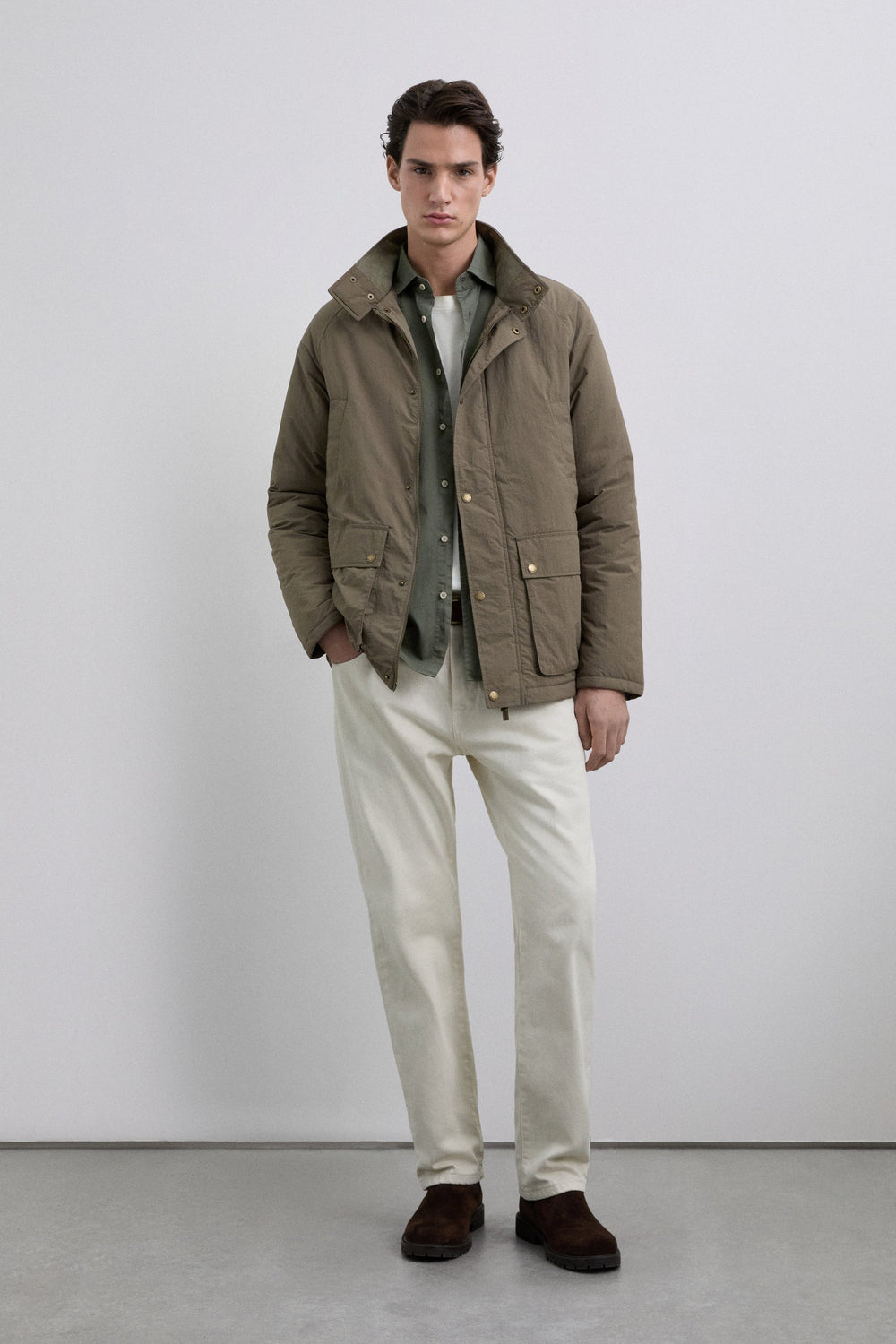 Cardigan técnico impermeável com mangas raglã. Quatro bolsos frontais. Fecho de correr e botões de pressão. Pormenor da etiqueta Scalpers na lateral e puxador Scalpers personalizado. Pormenor de bombazina no tom no interior da gola.