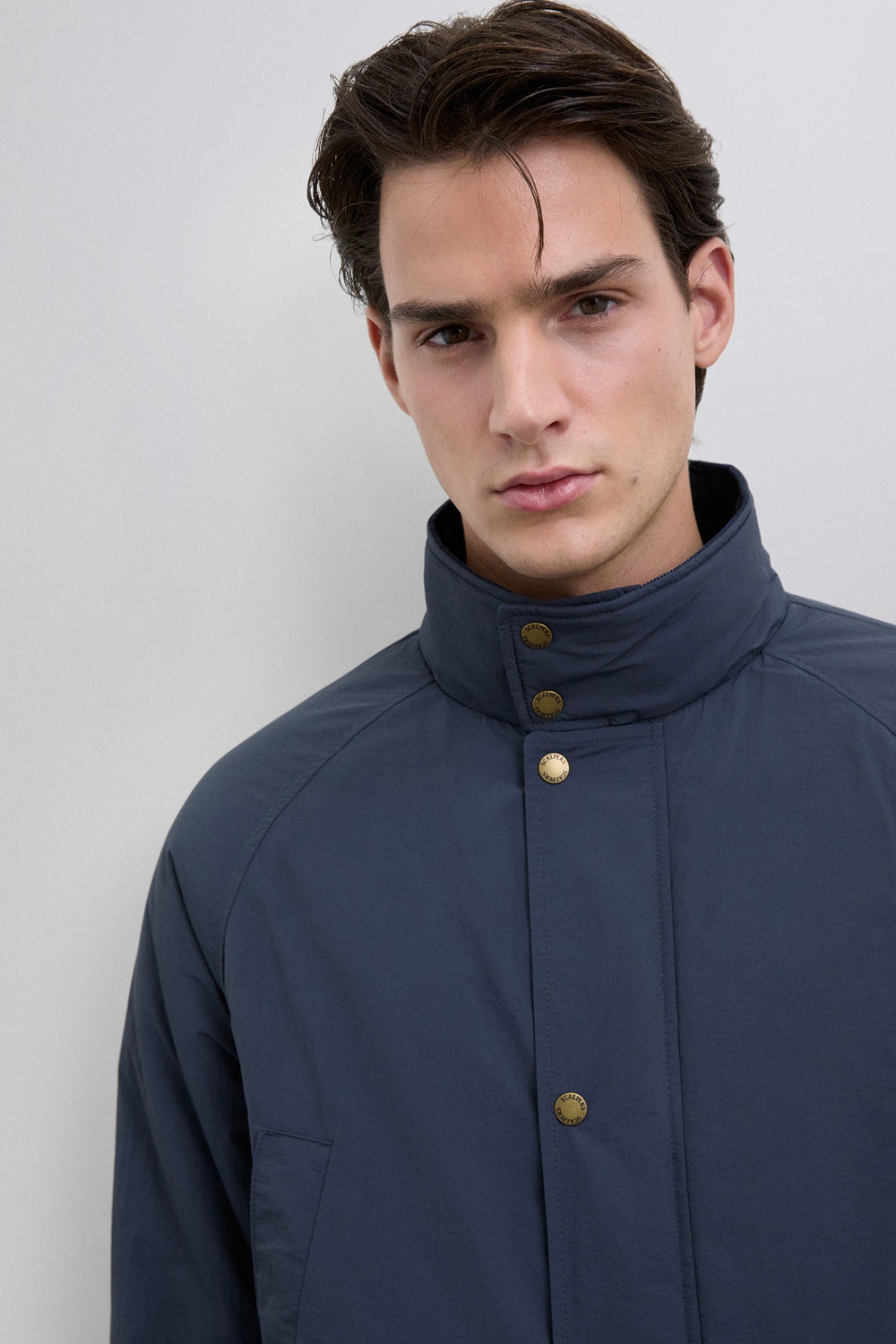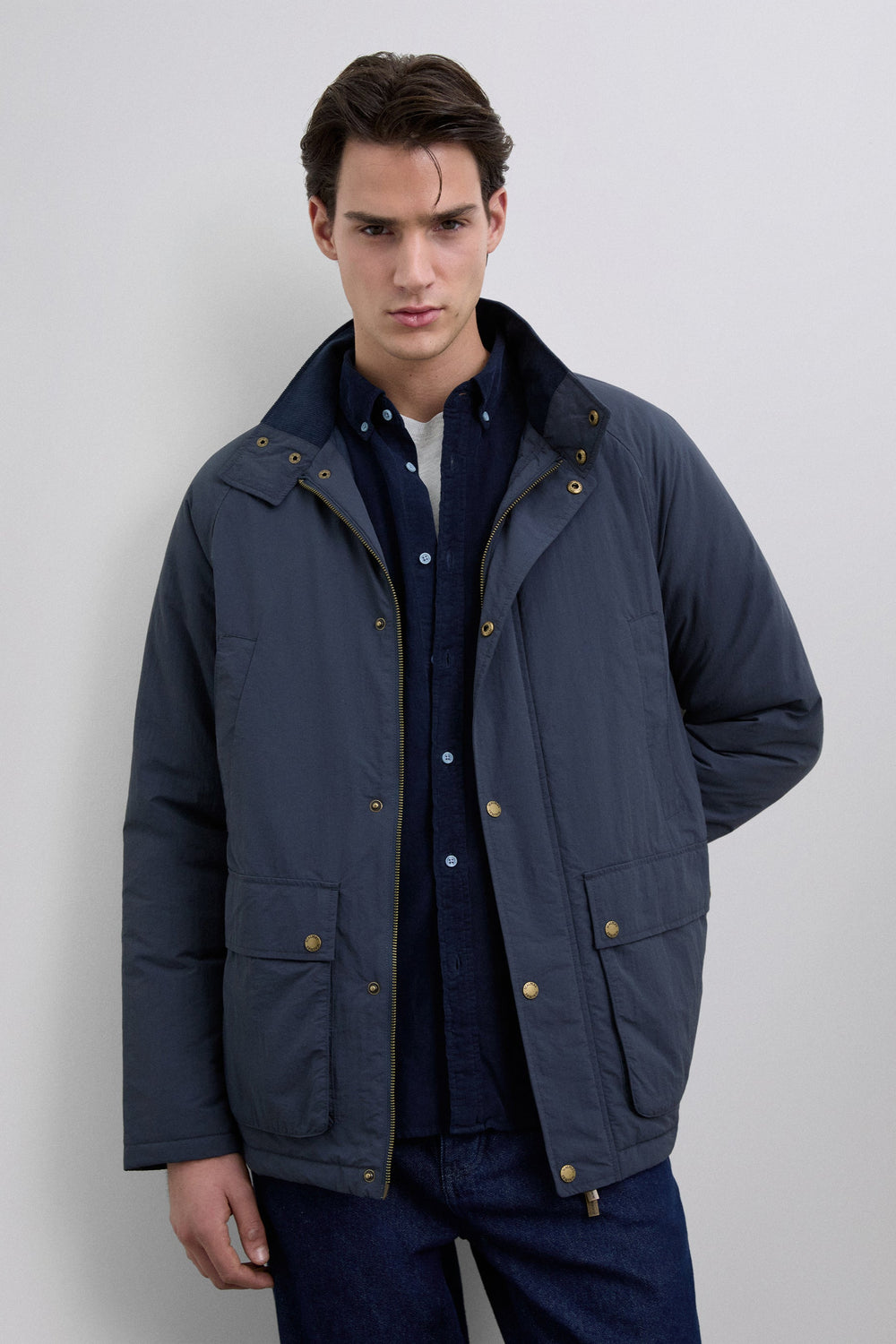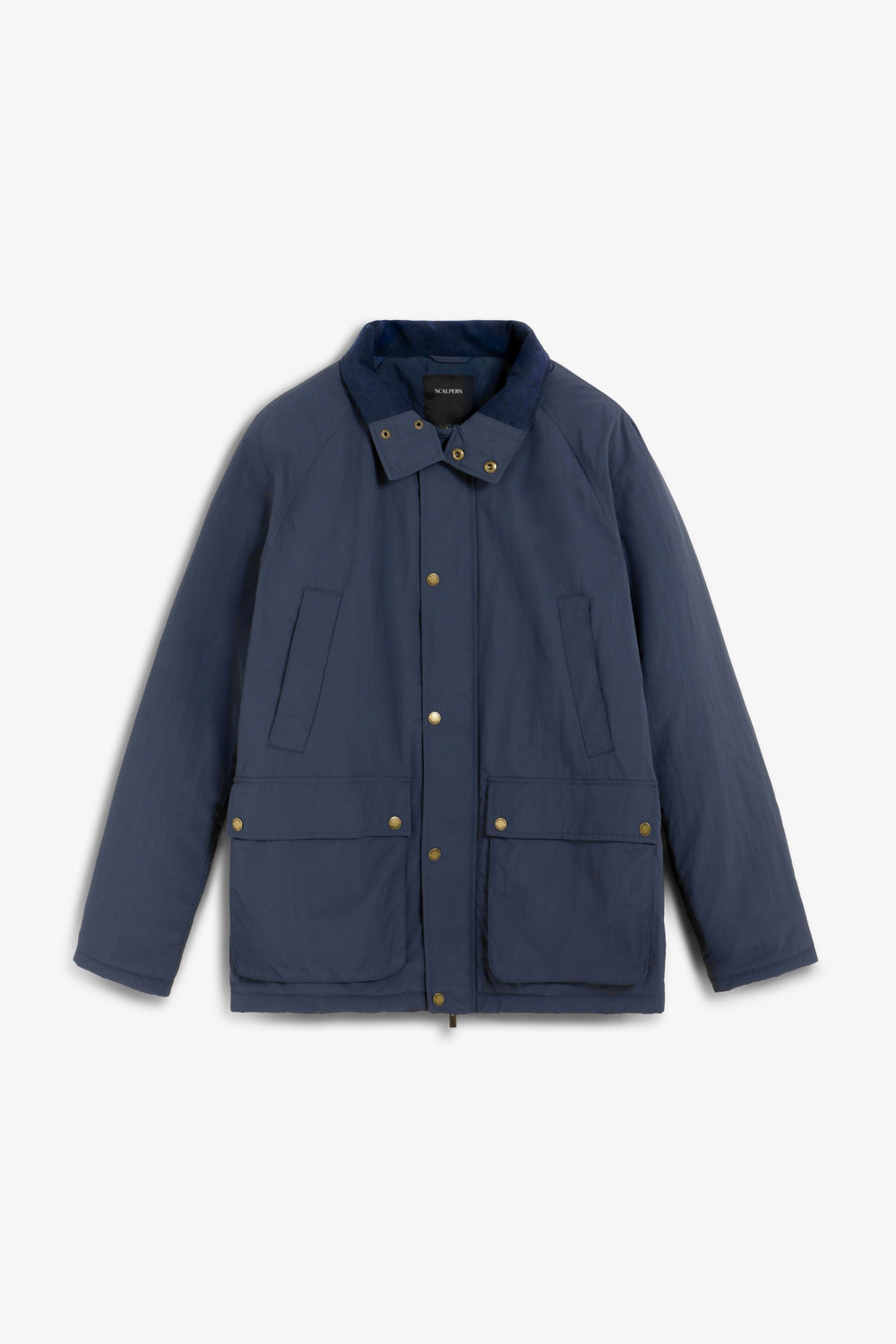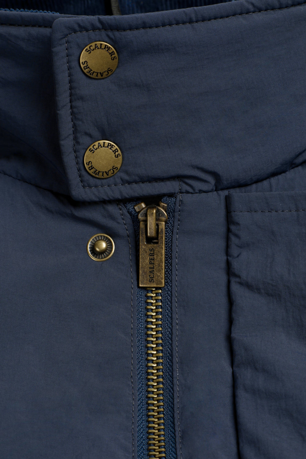 Cardigan técnico impermeável com mangas raglã. Quatro bolsos frontais. Fecho de correr e botões de pressão. Pormenor da etiqueta Scalpers na lateral e puxador Scalpers personalizado. Pormenor de bombazina no tom no interior da gola.
