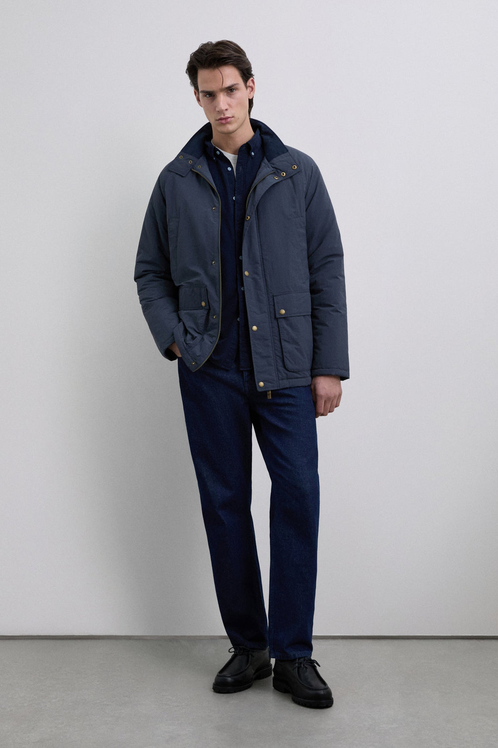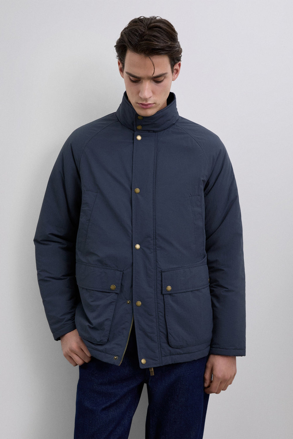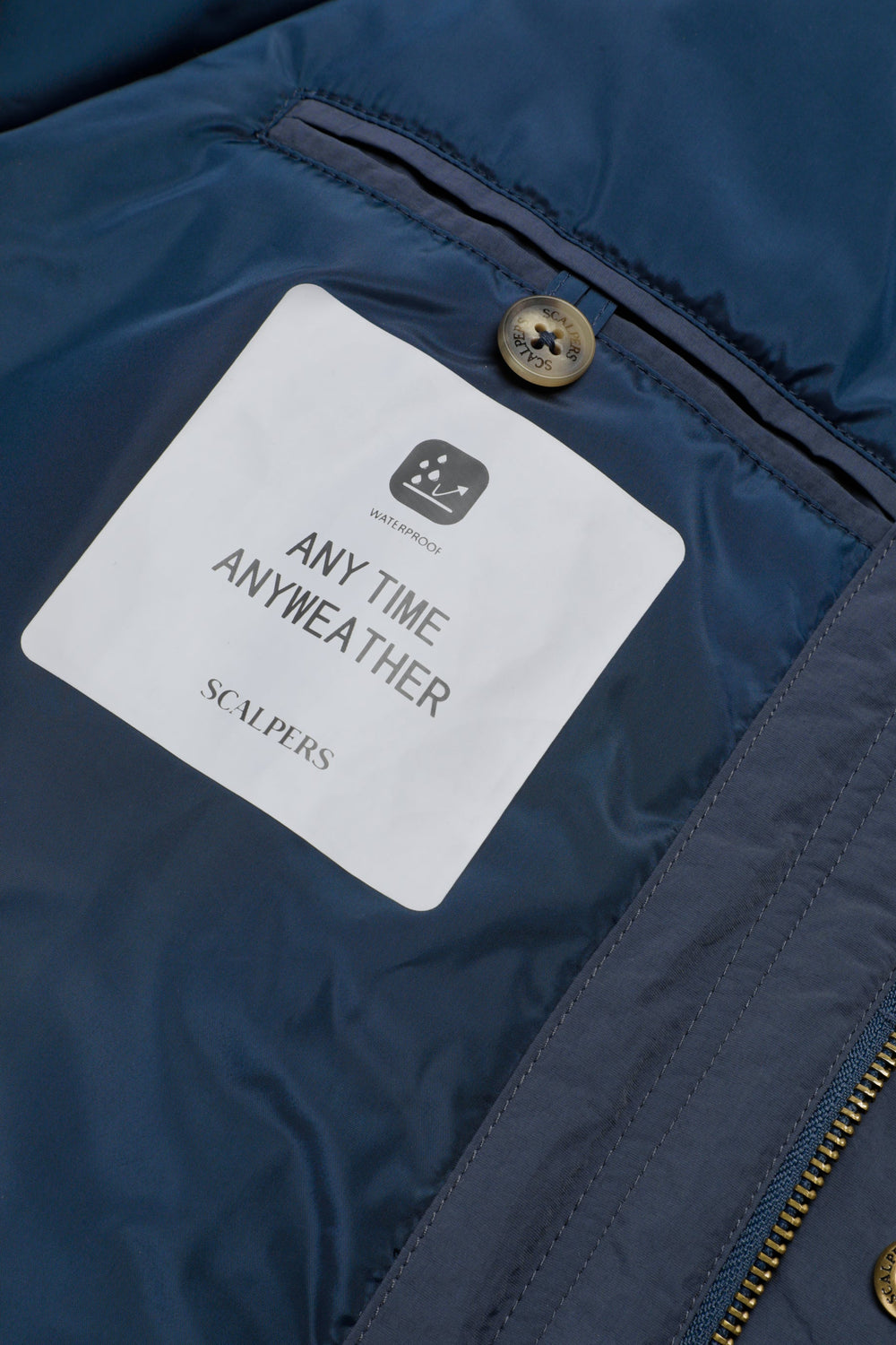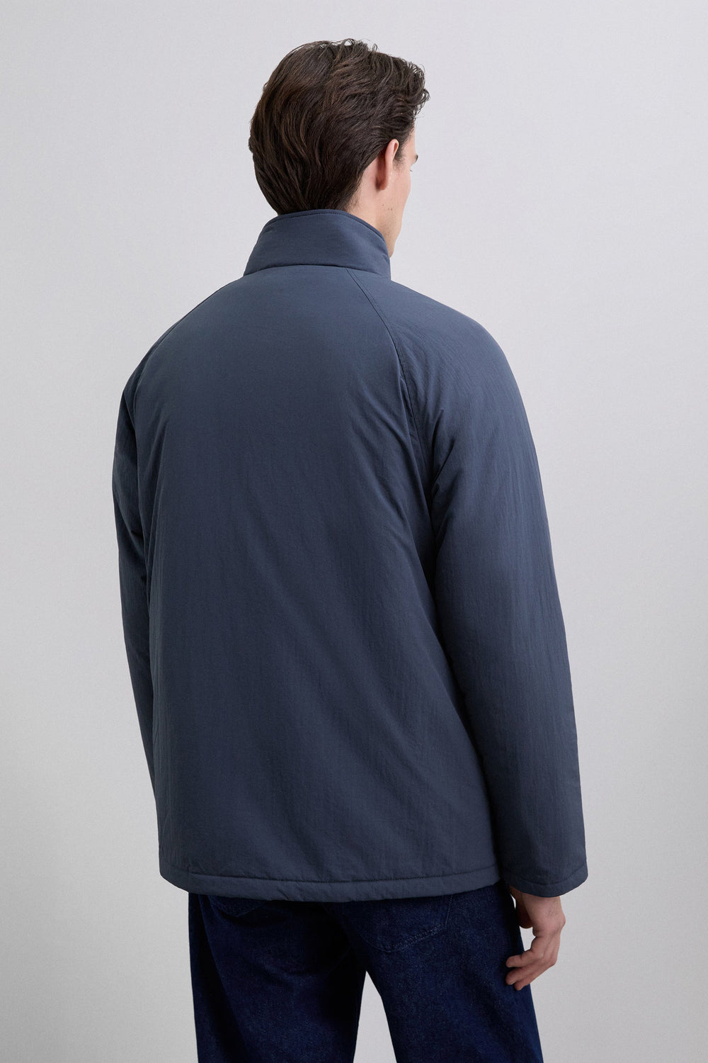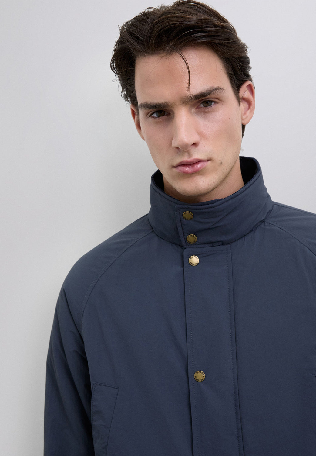 Cardigan técnico impermeável com mangas raglã. Quatro bolsos frontais. Fecho de correr e botões de pressão. Pormenor da etiqueta Scalpers na lateral e puxador Scalpers personalizado. Pormenor de bombazina no tom no interior da gola.