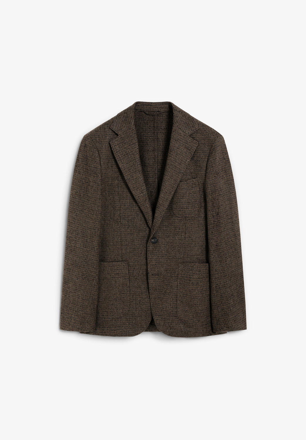 Blazer xadrez confecionado em lã. Aba regular. Três bolsos de remendo. Fecho frontal com dois botões. Manga comprida.