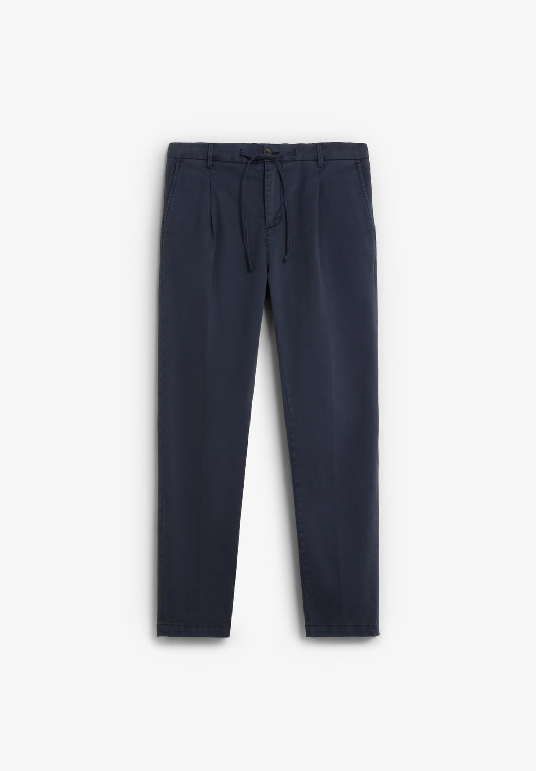 Calças confecionadas em algodão BCI. Relaxed fit. Fecho ajustável com cordão, fecho de correr e botão na cintura. Dois bolsos laterais, traseiros com fecho de botão e pregas à frente. Presilhas na cintura.