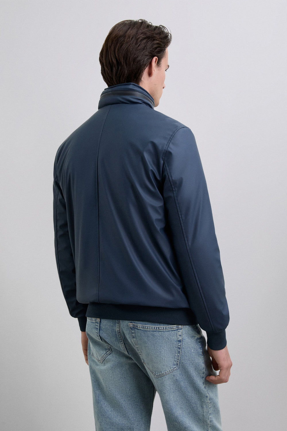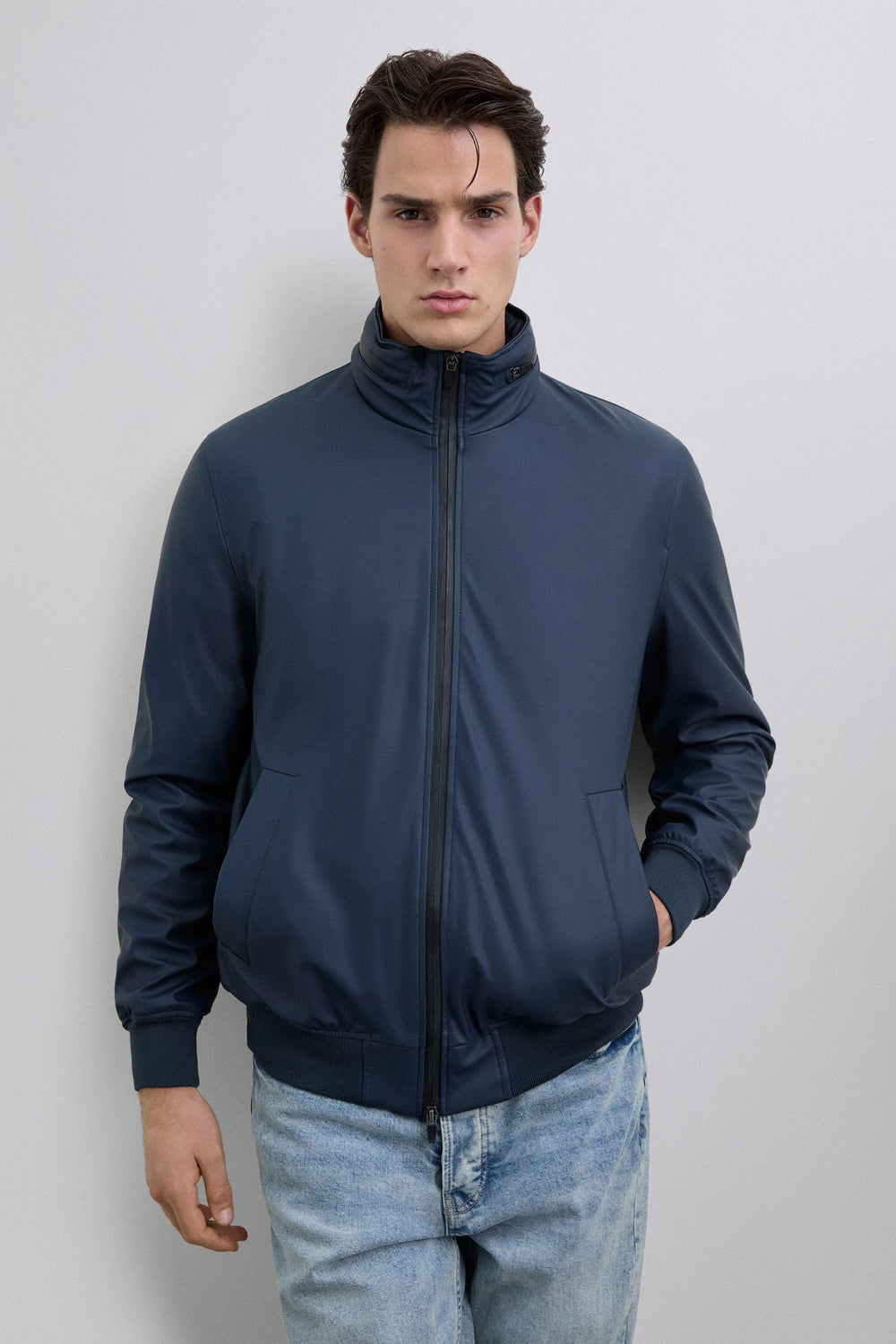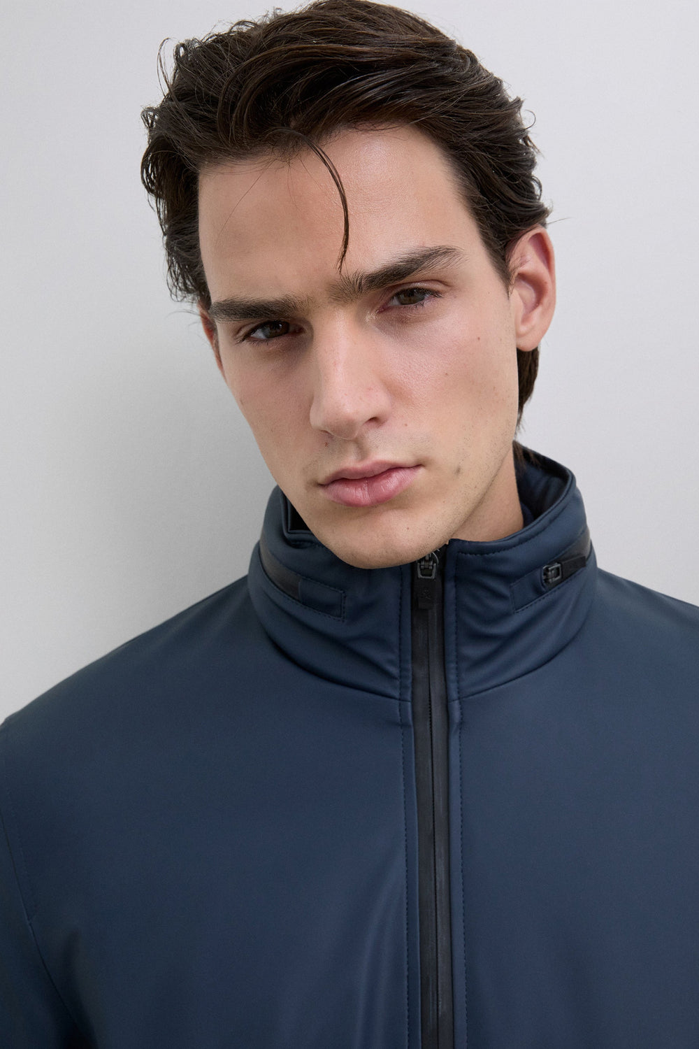 Cardigan impermeável e corta-vento com capuz oculto. Fecha à frente com fecho de correr termosselado. Punhos e bainha canelados. Dois bolsos à frente. Enchimento com acolchoado de 60 gramas. O capuz oculto na gola resiste a 5.000 mm de pressão de água. Logótipo efeito de caucho no bolso.