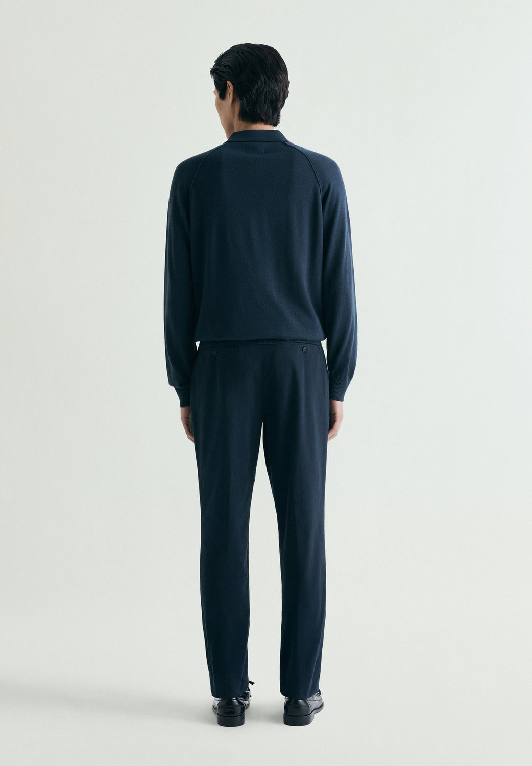 Calças confecionadas em mistura de algodão. Pinças frontais. Fecho frontal de botões com botão alargado na cintura. Presilhas na cintura. Bolsos traseiros com linhas vivas duplas e botão.