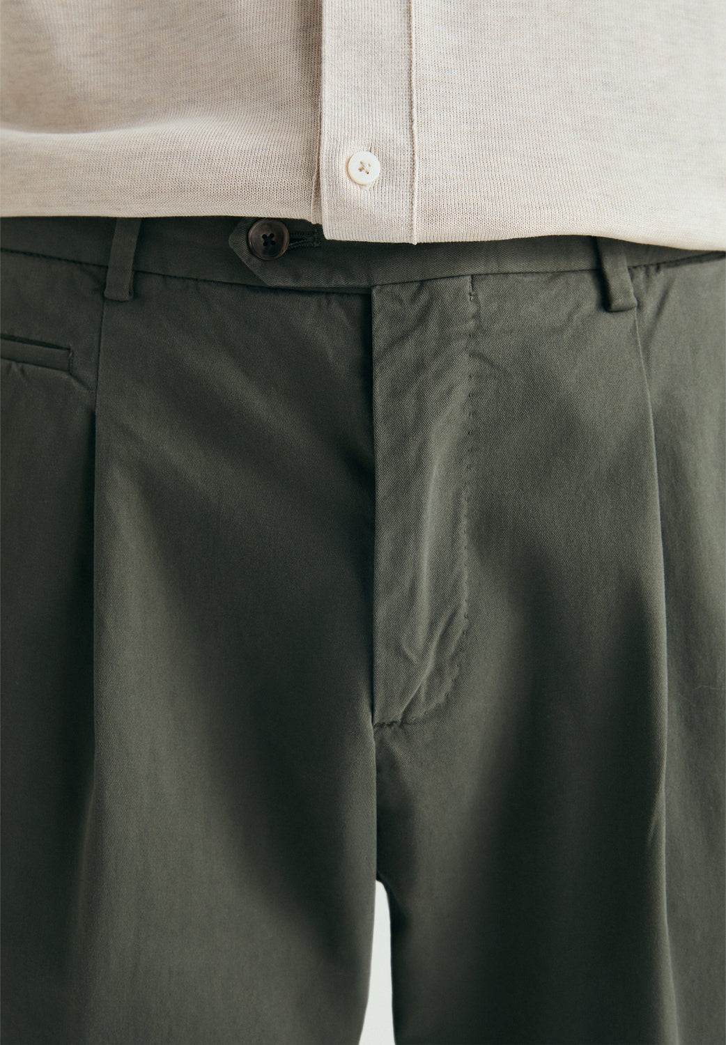 Calças confecionadas em mistura de algodão. Pinças frontais. Fecho frontal de botões com botão alargado na cintura. Presilhas na cintura. Bolsos traseiros com linhas vivas duplas e botão.
