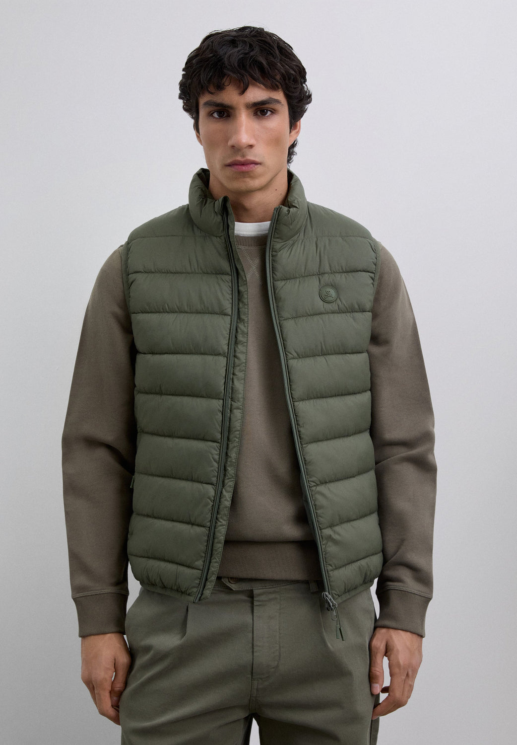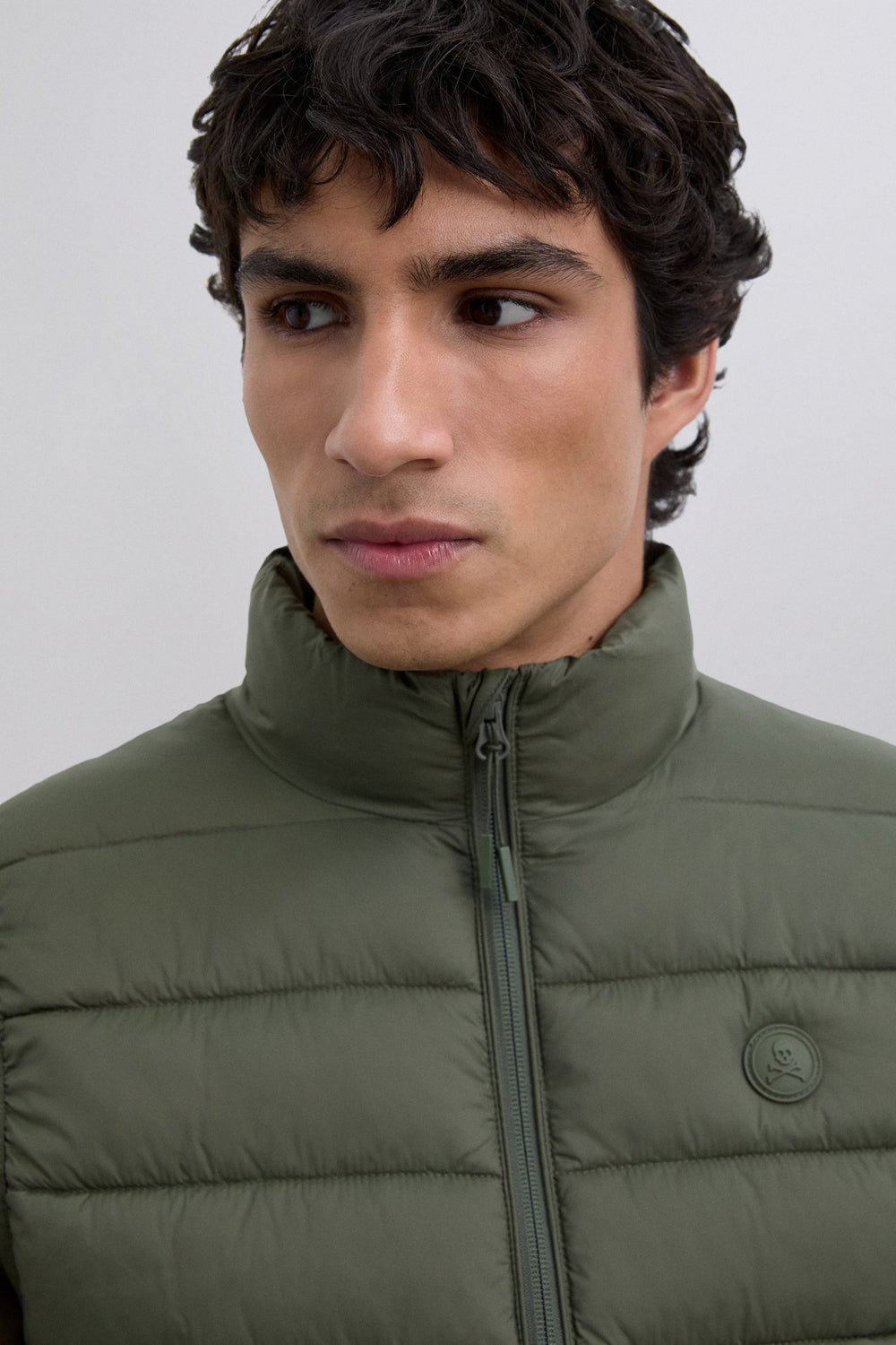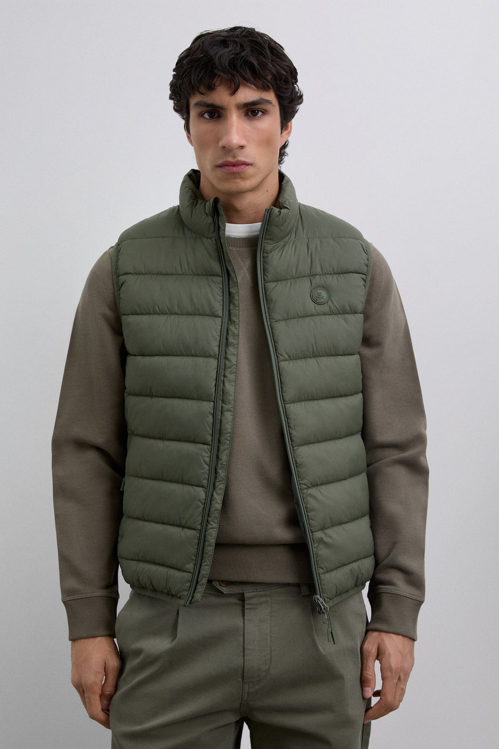 Colete acolchoado. Repelente à água. Forro confecionado em tecido técnico. Bolsos laterais ocultos com forro polar. Fecho zip duplo gravado. Remendo efeito de caucho com logótipo no tom no peito.
