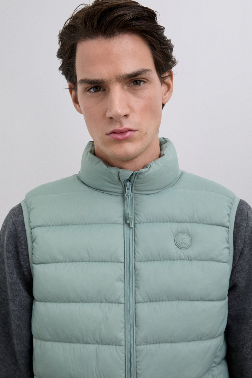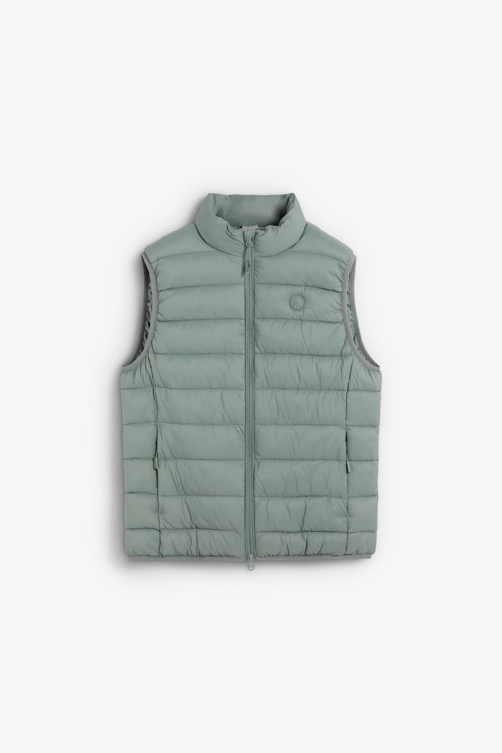 Colete acolchoado. Repelente à água. Forro confecionado em tecido técnico. Bolsos laterais ocultos com forro polar. Fecho zip duplo gravado. Remendo efeito de caucho com logótipo no tom no peito.