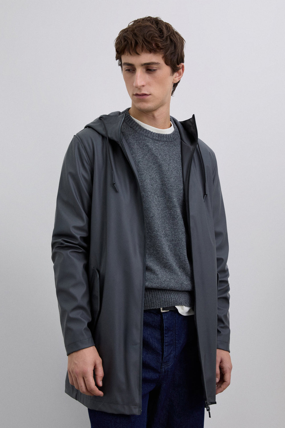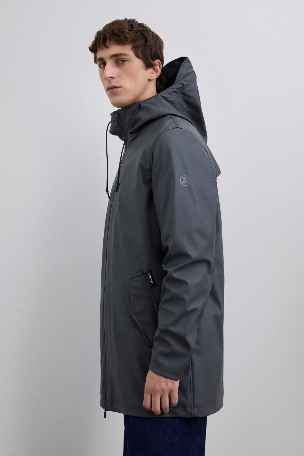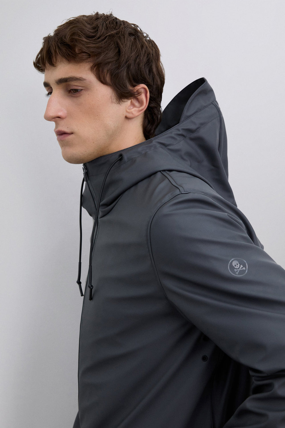 Cardigan impermeável. Gola com capuz ajustável com cordão. Fecho zip duplo termosselado. Manga comprida. Bolsos laterais com aba e botão de pressão. Pormenor do logótipo efeito de caucho em contraste na parte inferior e skull no tom no fecho de correr.
