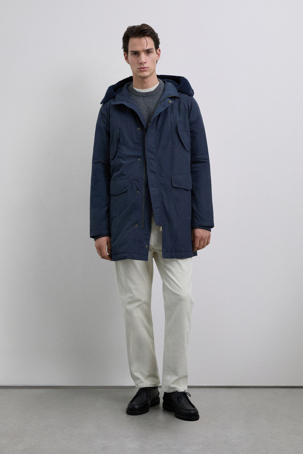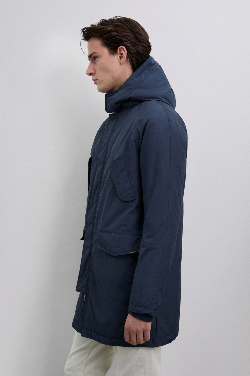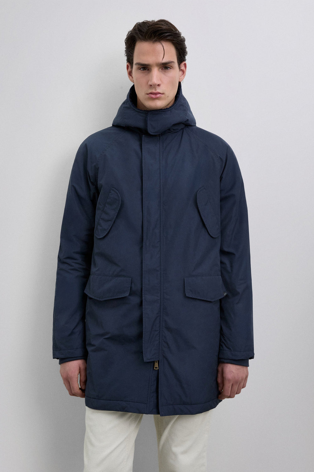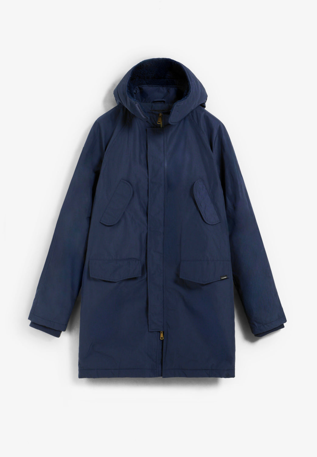 Parka impermeável com capuz. Fecho frontal com fecho de correr. Manga comprida. Peça de roupa com enchimento acolchoado. Quatro bolsos frontais, dois inclinados com aba e dois a direito na parte inferior. Interior com enchimento thermolite. Pormenor do forro polar no capuz. Fecho da gola com velcro. Pormenor de remendo efeito de caucho com logótipo no bolso e padrão de skull na manga.