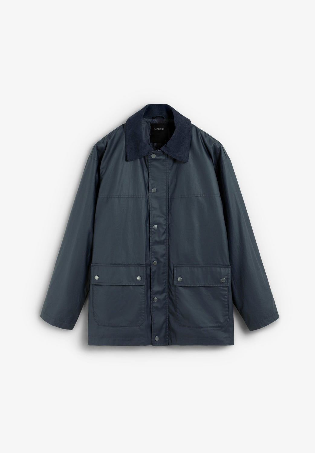 Cardigan confecionado em 100% algodão BCI. Tecido com efeito encerado. Dois bolsos à frente. Pormenor de bombazina na gola e no bolso interior. Fecho com zip oculto por placket com botões de pressão.