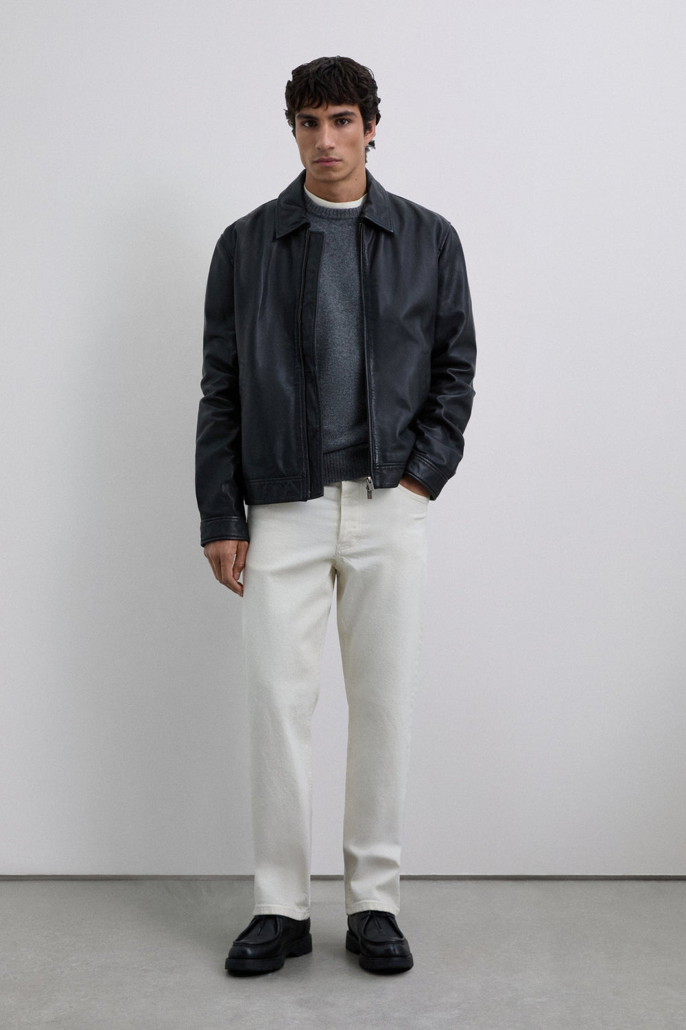 Casaco confecionado em 100% pele. Gola de camisa. Manga comprida. Fecho com duplo zip. Dois bolsos à frente. Punhos com botão. Pormenores bordados de logótipo e skull no interior.