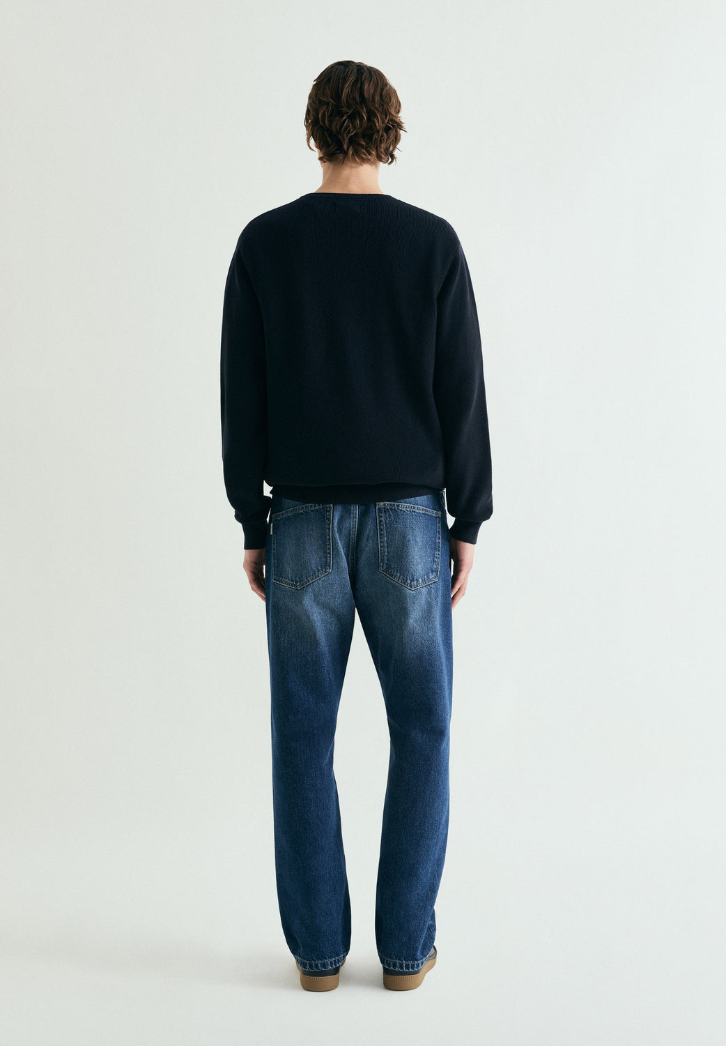 Jeans regular fit. Cinco bolsos. Efeito desbotado. Presilhas na cintura. Fecho frontal com fecho de correr e botão.