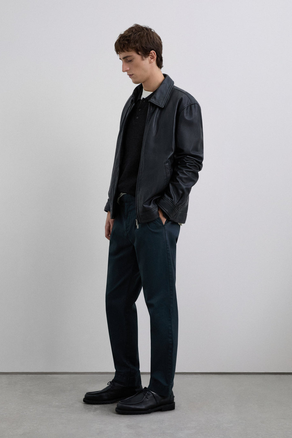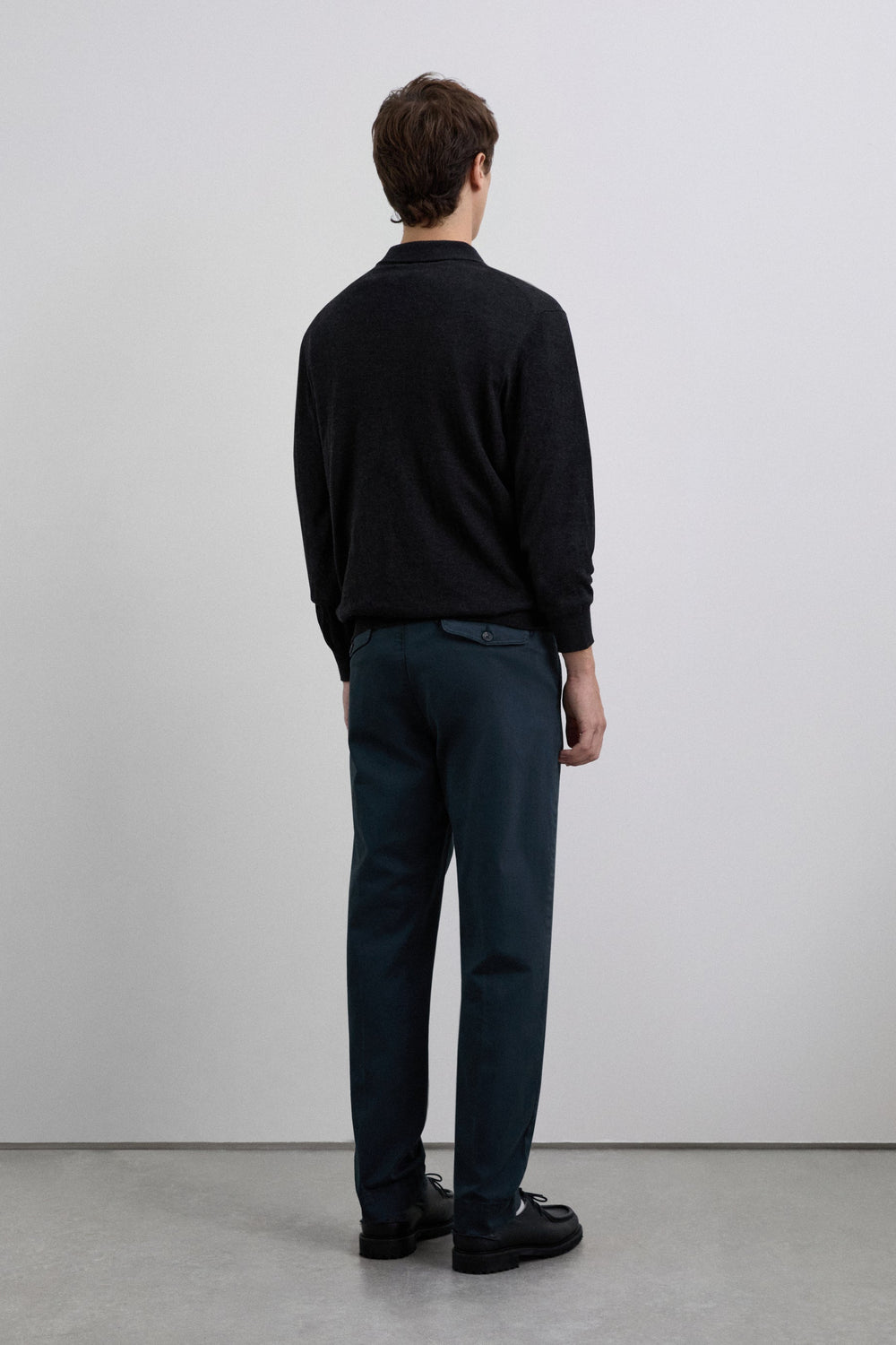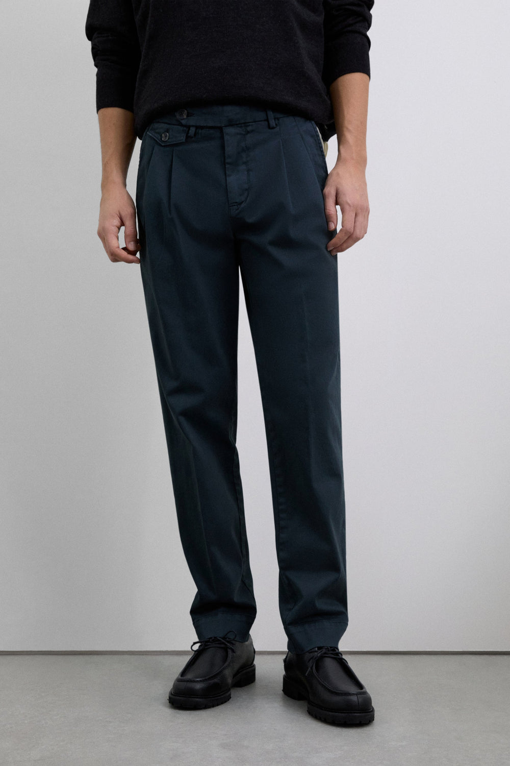 Calças de pinça confecionadas em algodão. Regular fit. Cintura com pormenor de pregas à frente. Bolsos laterais e pormenor de bolsos traseiros de linhas vivas. Fecho de correr e botão à frente.