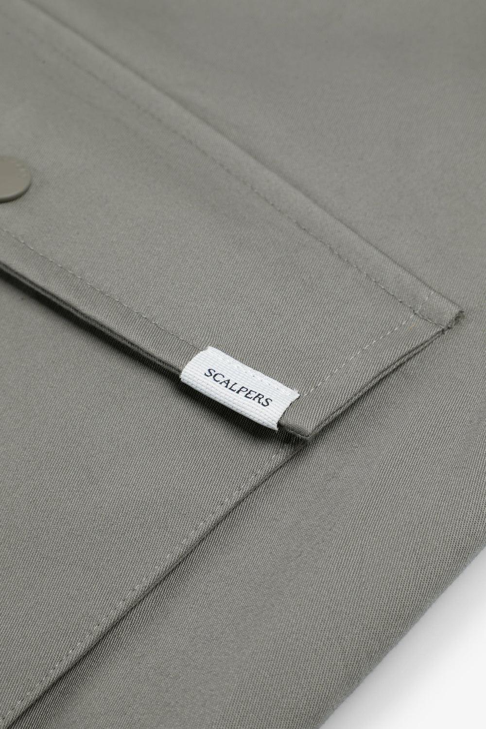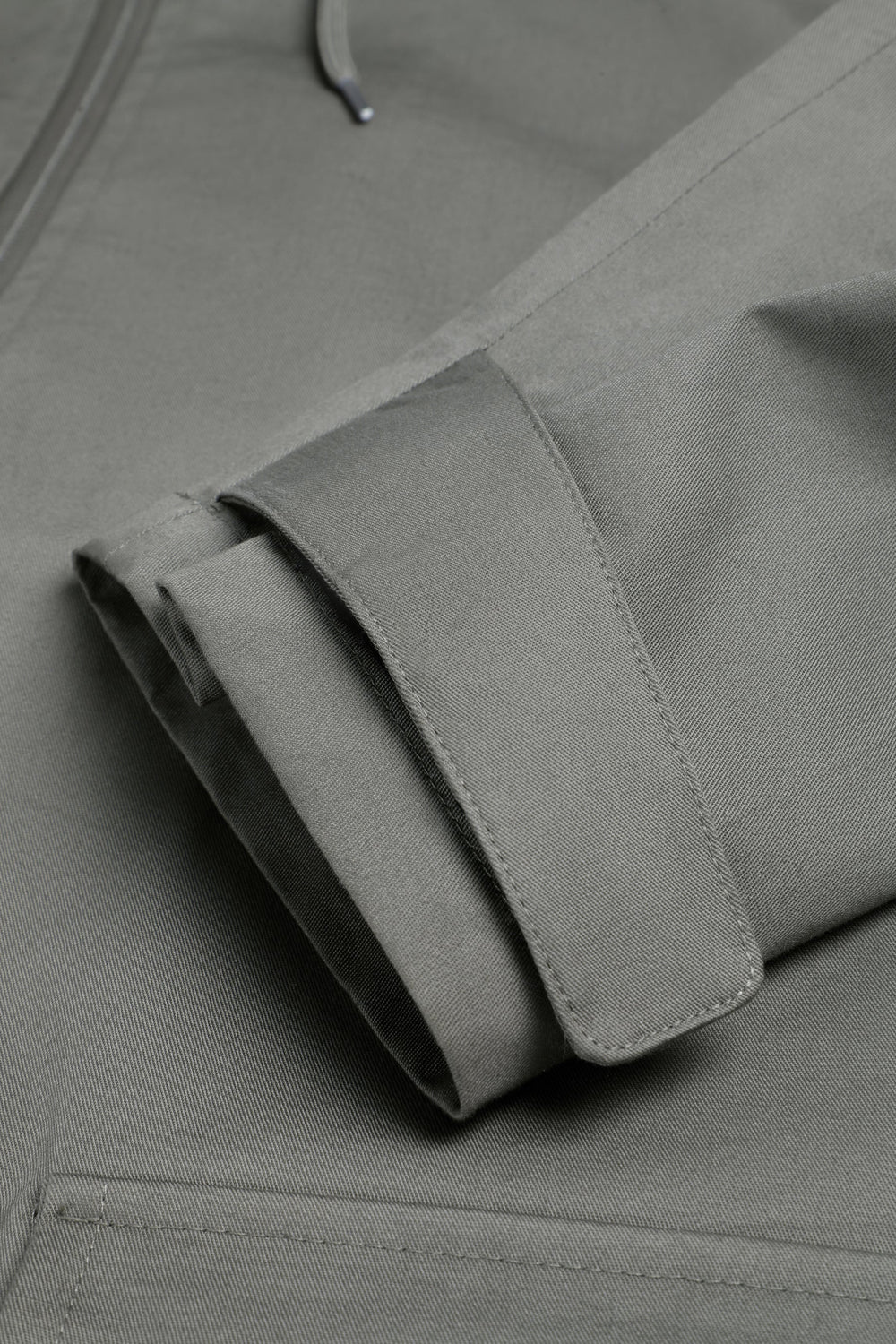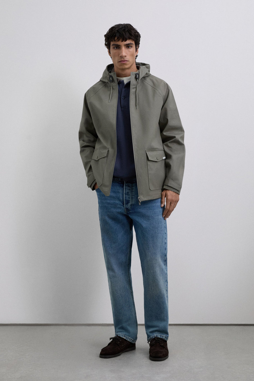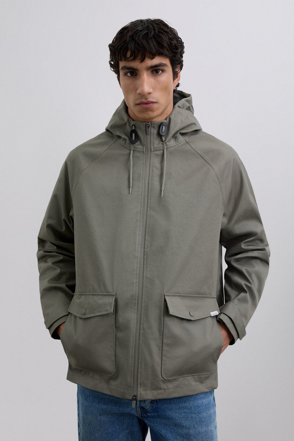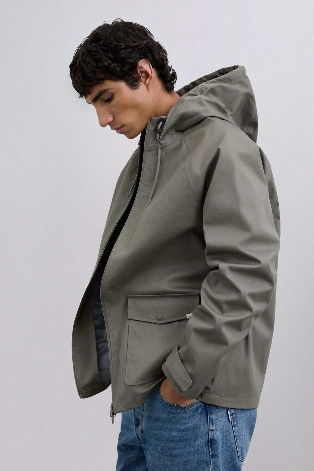 Cardigan técnico impermeável confecionado em 100% algodão. Capuz ajustável com cordão de ajuste e pormenor em pele. Mangas raglã. Ajustadores de punho com velcro. Fecho frontal com fecho de correr termosselado de duplo puxador e alfinetes personalizados. Dois bolsos frontais com aba e dupla entrada, superior e lateral, com fechos de alfinete. Pormenor de etiqueta com logótipo no bolso frontal.