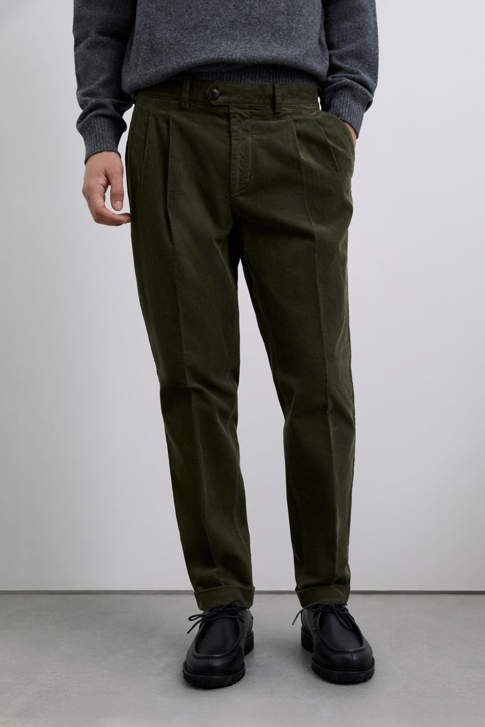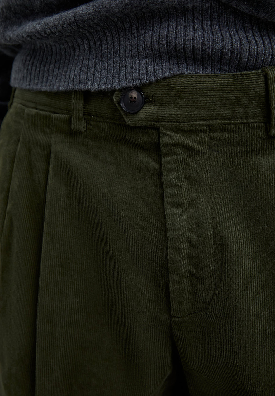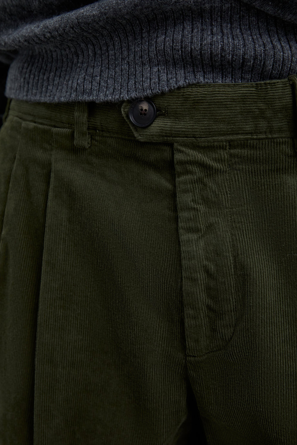 Calças chinos de bombazina confecionadas em algodão. Corte loose fit com pinças. Fecho com zip oculto e botão prolongado na cintura. Bolsos laterais e atrás.