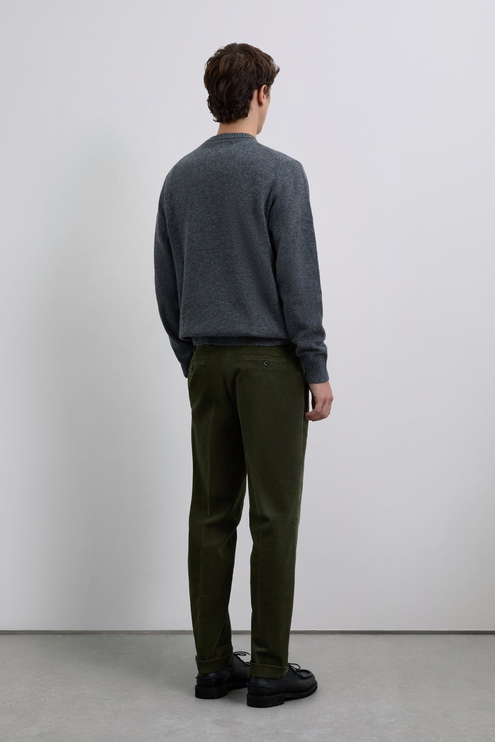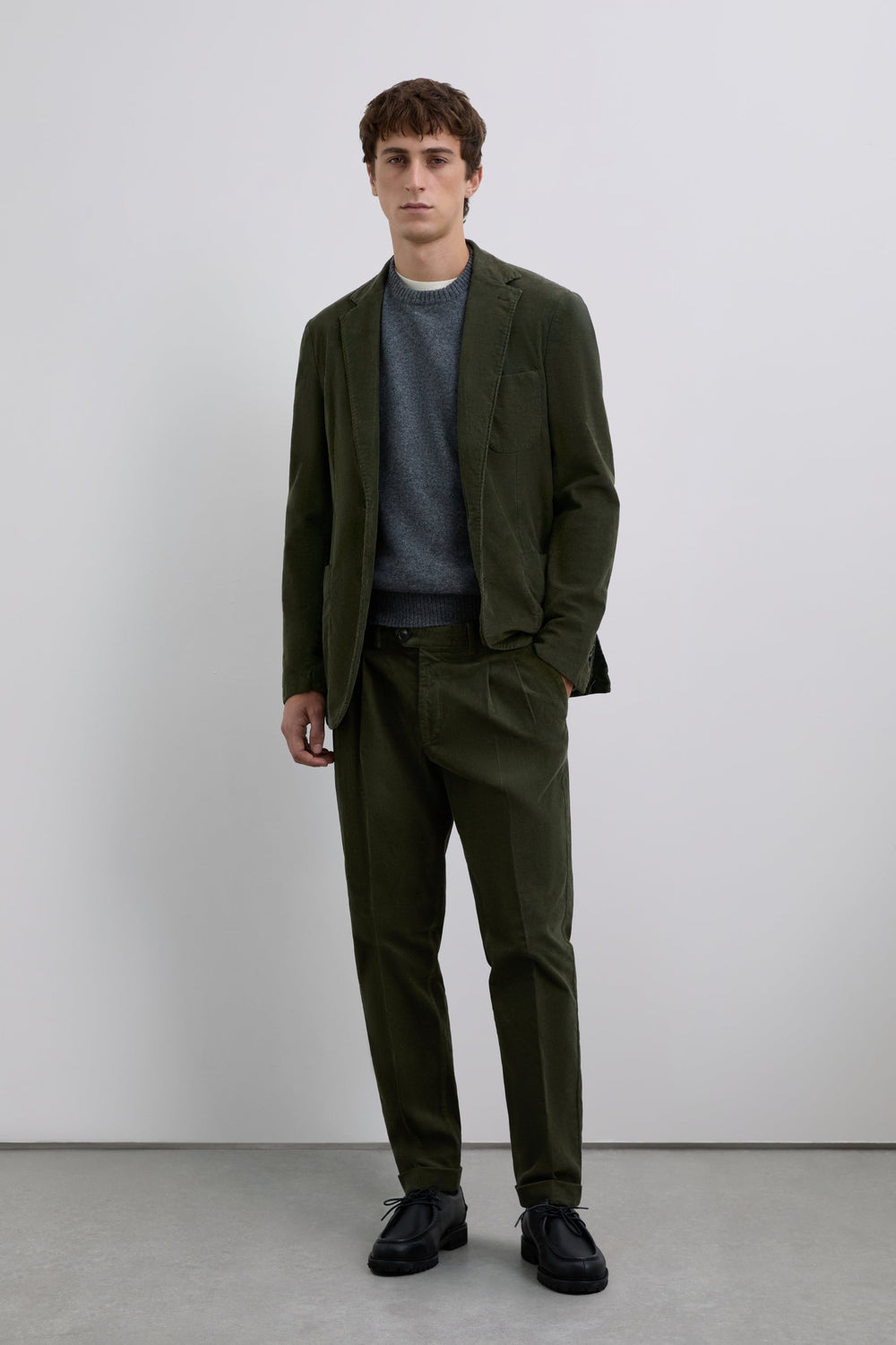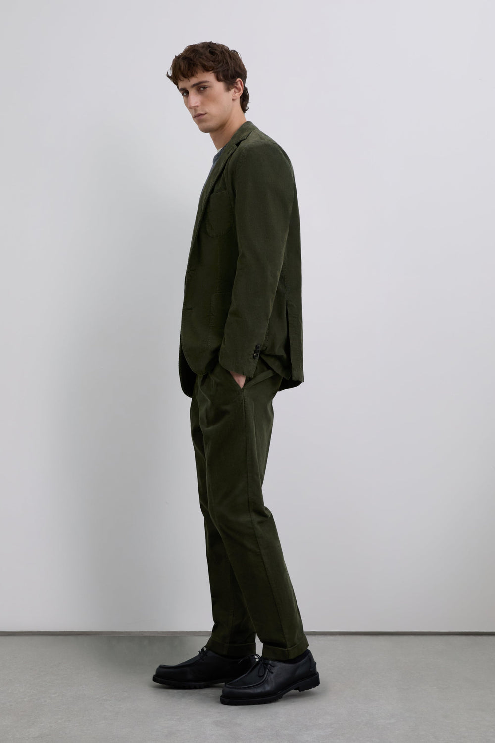 Calças chinos de bombazina confecionadas em algodão. Corte loose fit com pinças. Fecho com zip oculto e botão prolongado na cintura. Bolsos laterais e atrás.