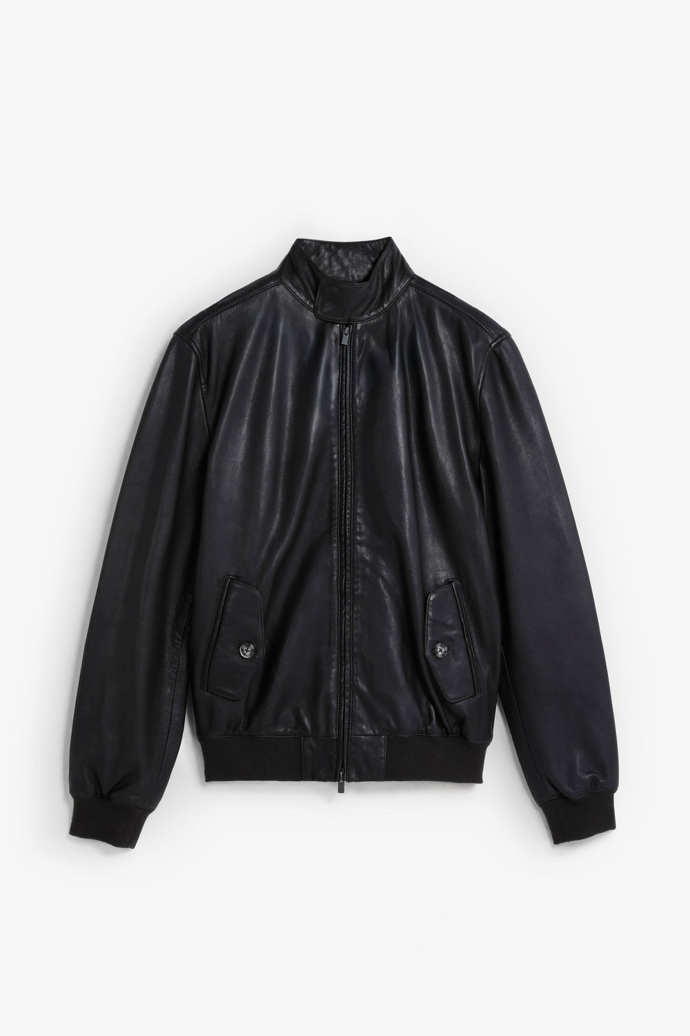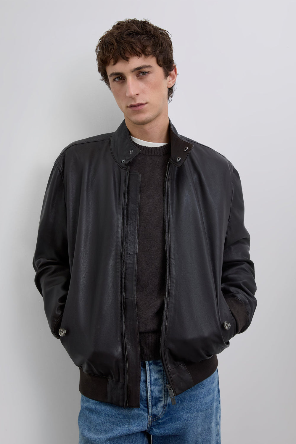 Casaco confecionado em 100% pele. Manga comprida. Fecho frontal com fecho zip duplo. Gola alta com fecho de duplo alfinete. Dois bolsos frontais com aba e botão. Punhos e bainha canelados.