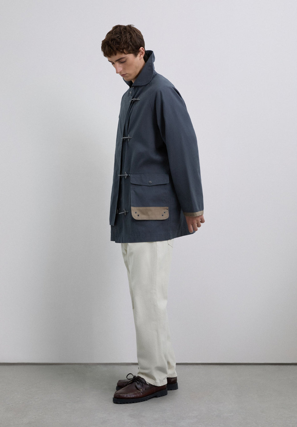 Cardigan confecionado em 100% algodão orgânico. Bolsos de botão à frente. Bolsos laterais com pormenores de ilhós. Corte oversize Decote redondo estilo camisa. Manga raglã. Fecha com alfinetes e toggles. Linhas vivas de camurça na parte inferior da manga e na parte inferior do bolso.