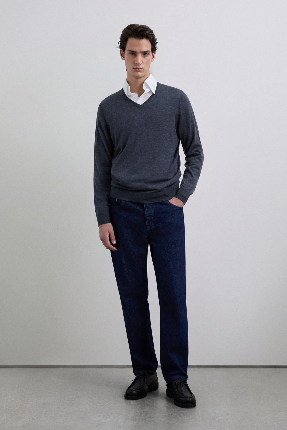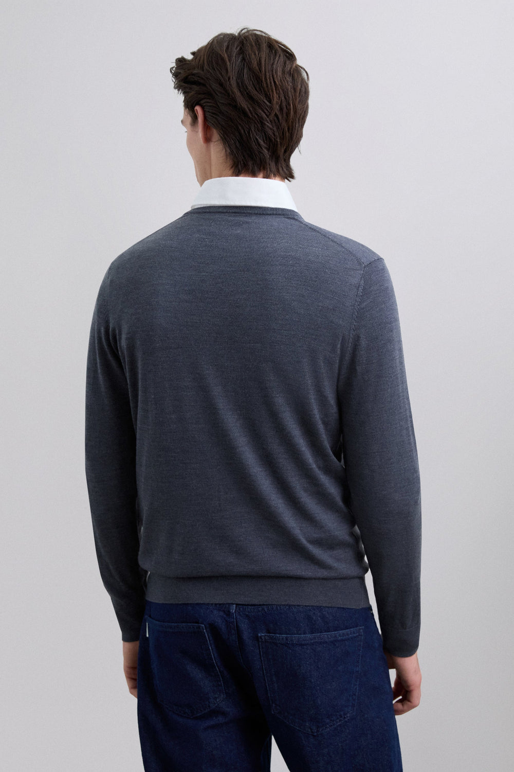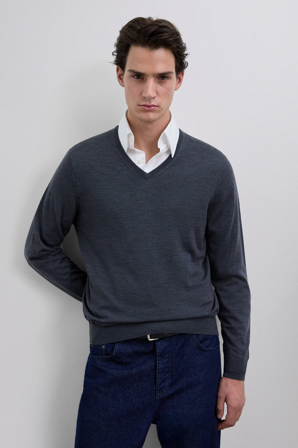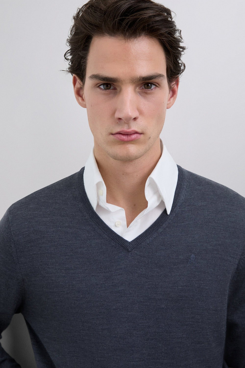 Sweater confecionada em 100% lã. Regular fit. Decote em V. Manga comprida. Pormenor de logótipo bordado no tom no peito. Acabamentos em nervuras.