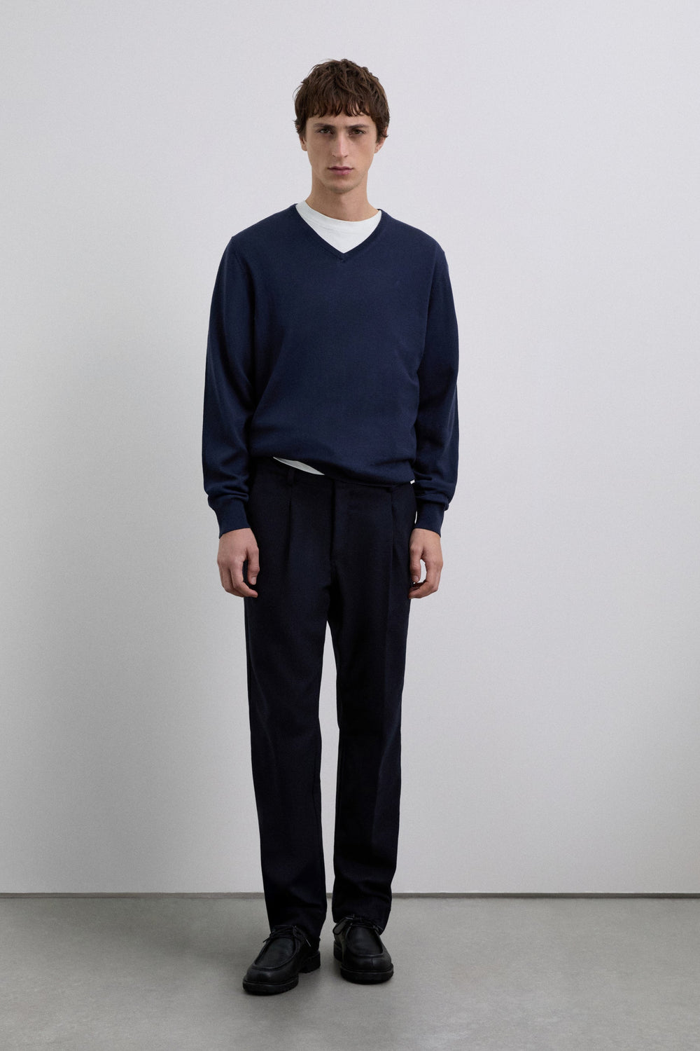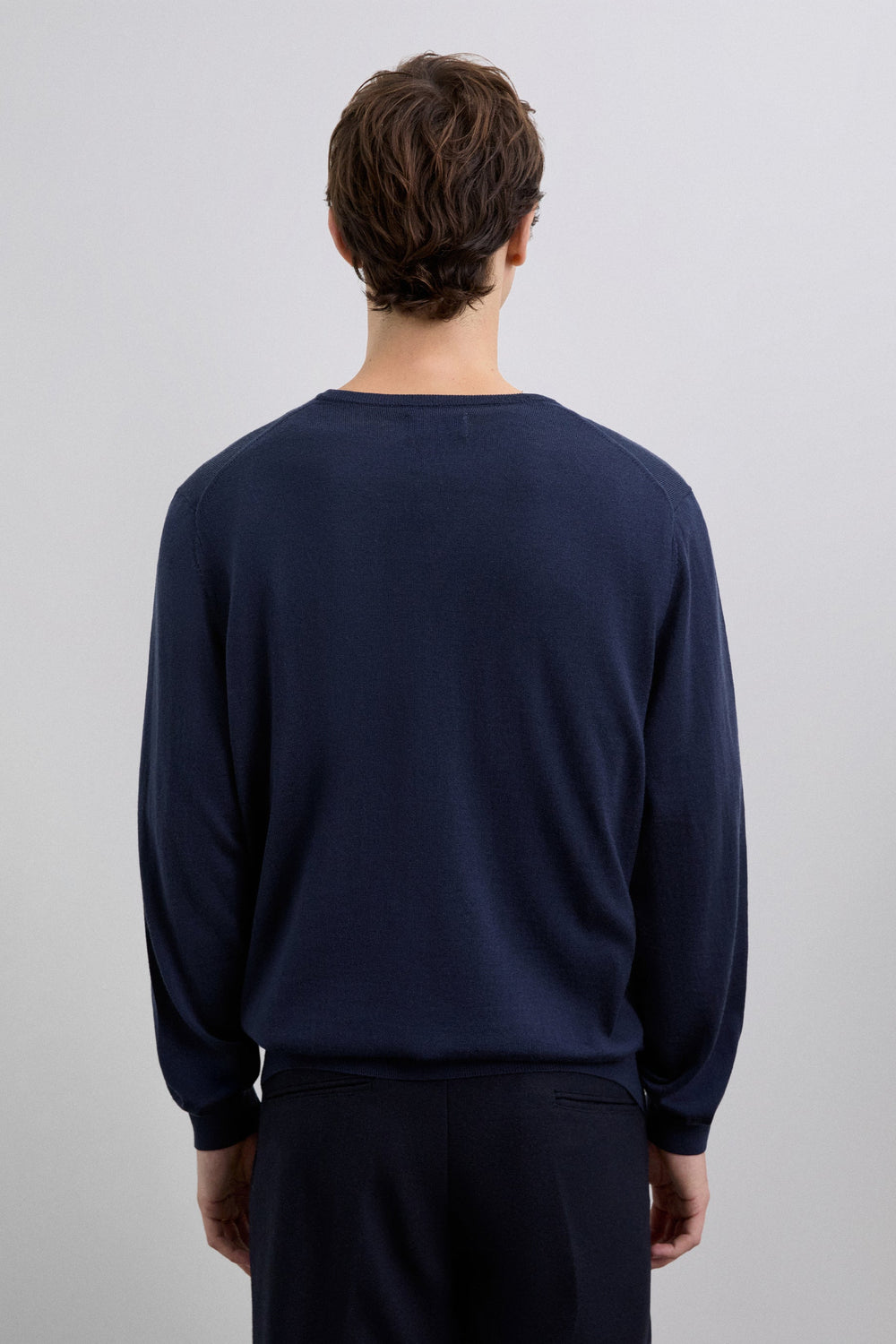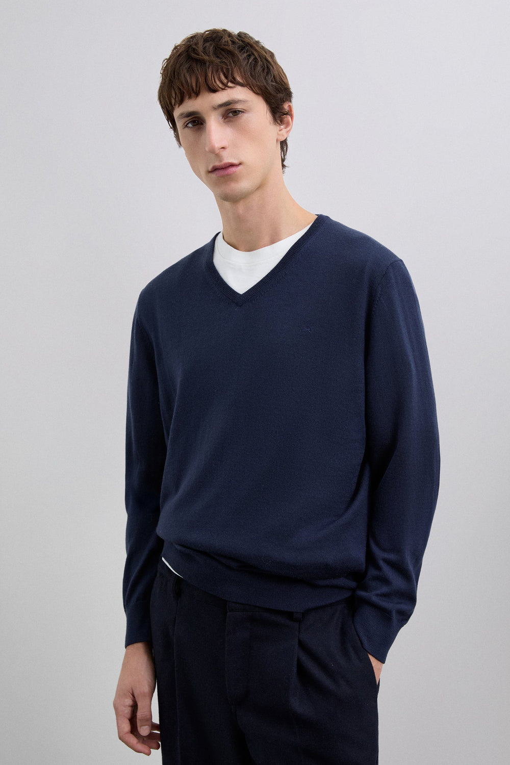 Sweater confecionada em 100% lã. Regular fit. Decote em V. Manga comprida. Pormenor de logótipo bordado no tom no peito. Acabamentos em nervuras.