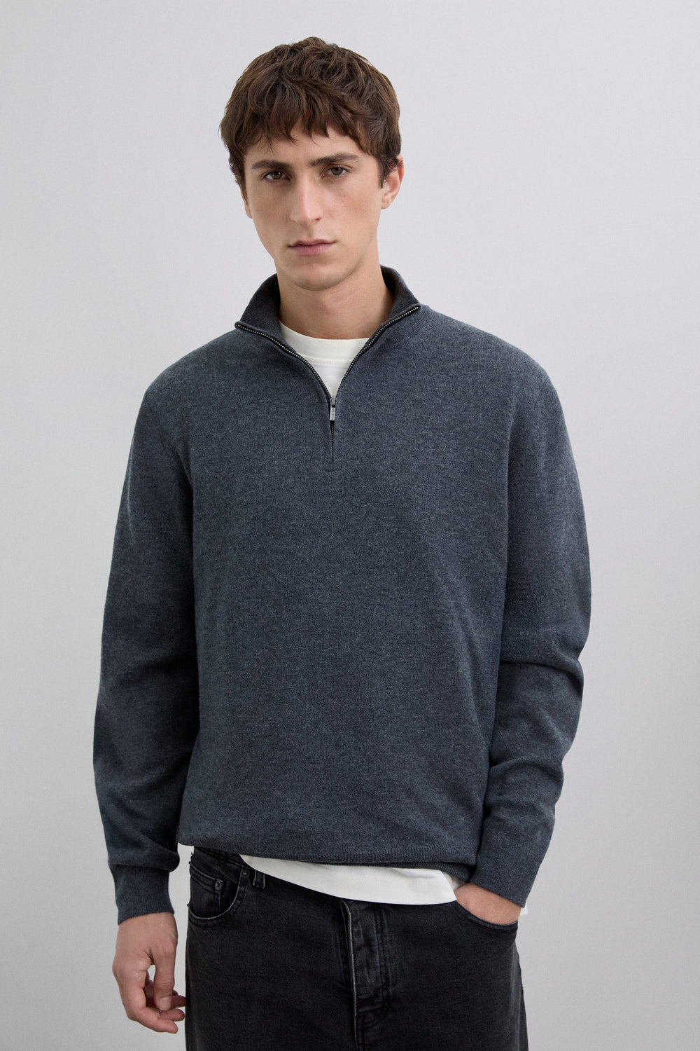 Sweater confecionada em 100% lã. Regular fit. Gola de fecho com meio fecho de correr. Manga comprida. Pormenor de skull bordada no tom no peito. Acabamentos em nervuras.