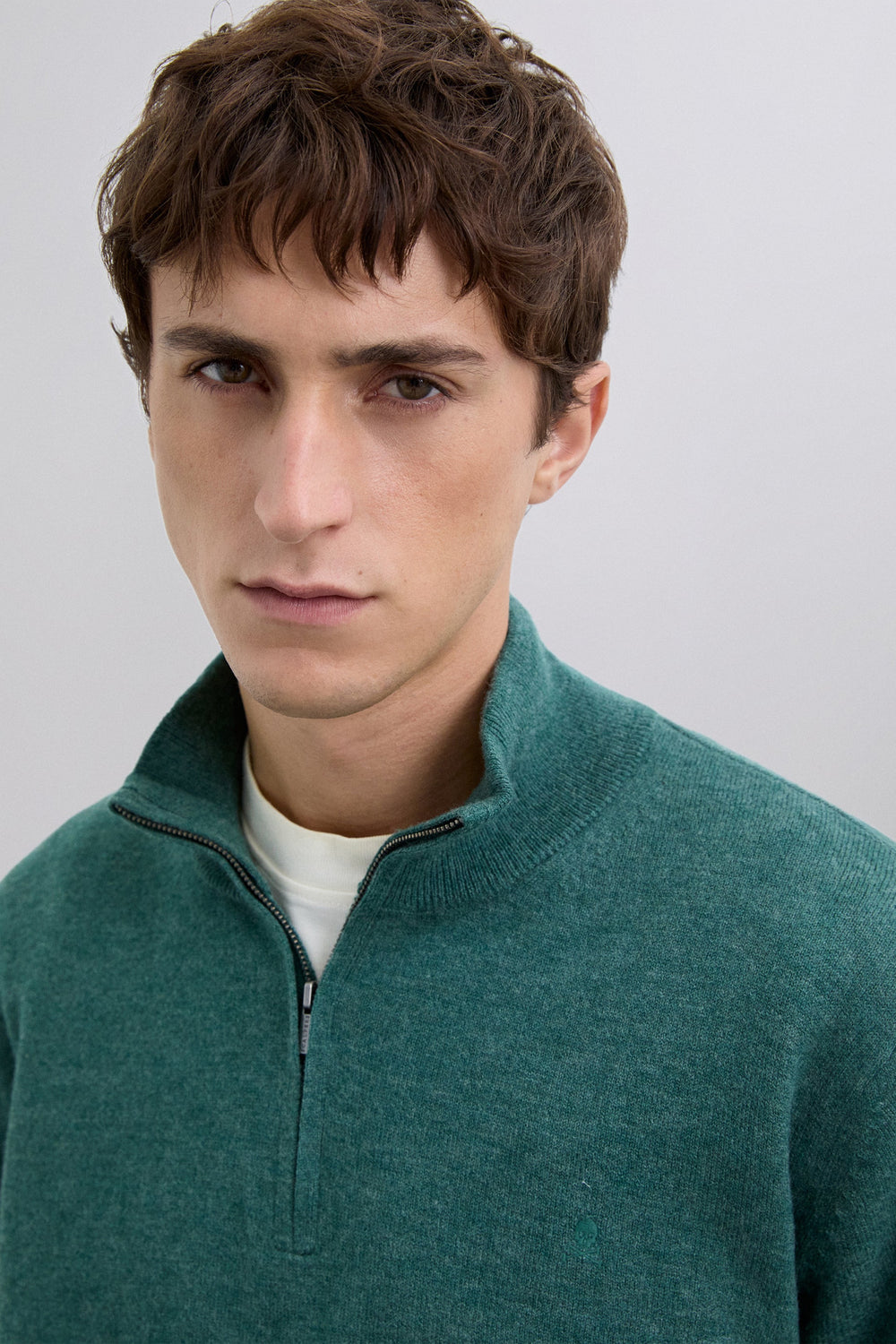 Sweater confecionada em 100% lã. Regular fit. Gola de fecho com meio fecho de correr. Manga comprida. Pormenor de skull bordada no tom no peito. Acabamentos em nervuras.
