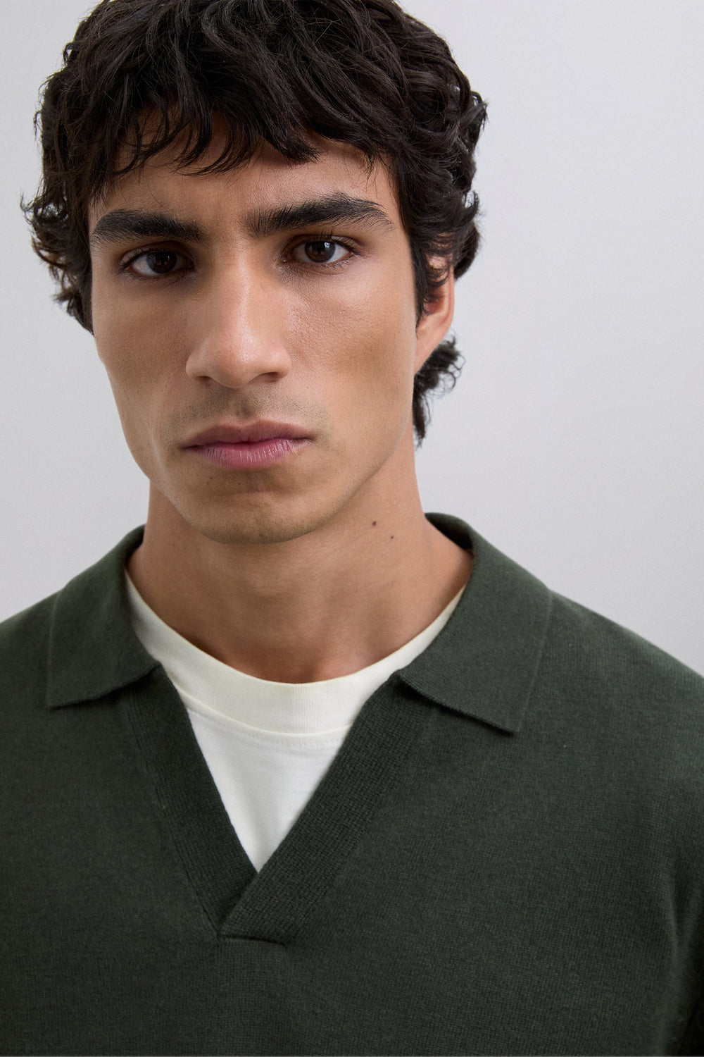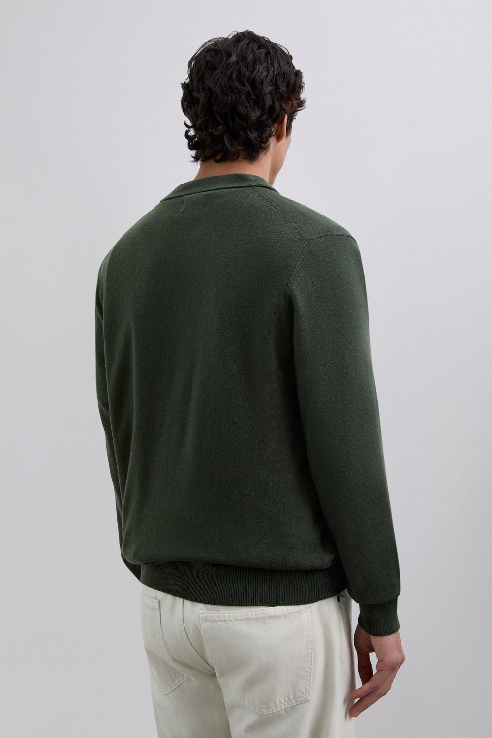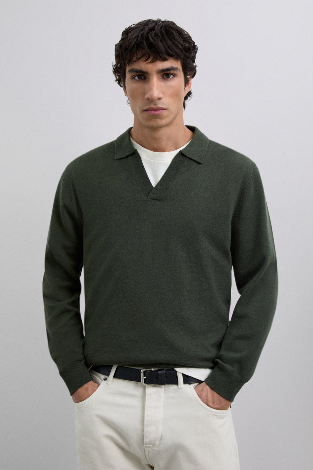 Camisa polo de malha confecionada em lã. Manga comprida. Acabamentos em nervuras. Decote em V.