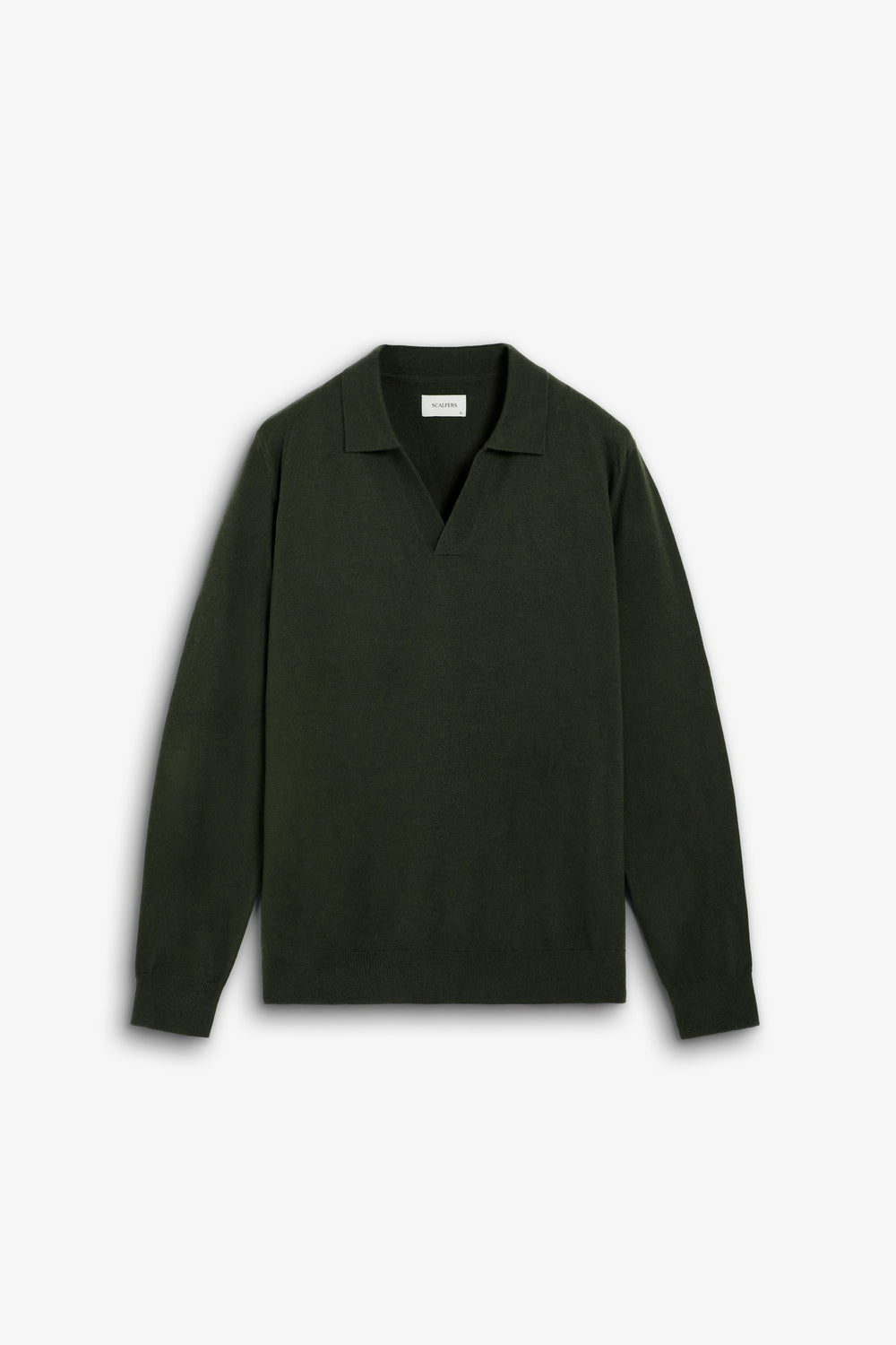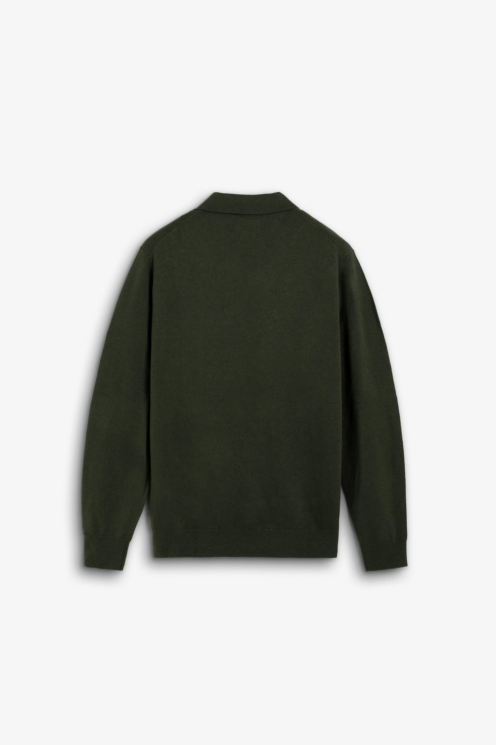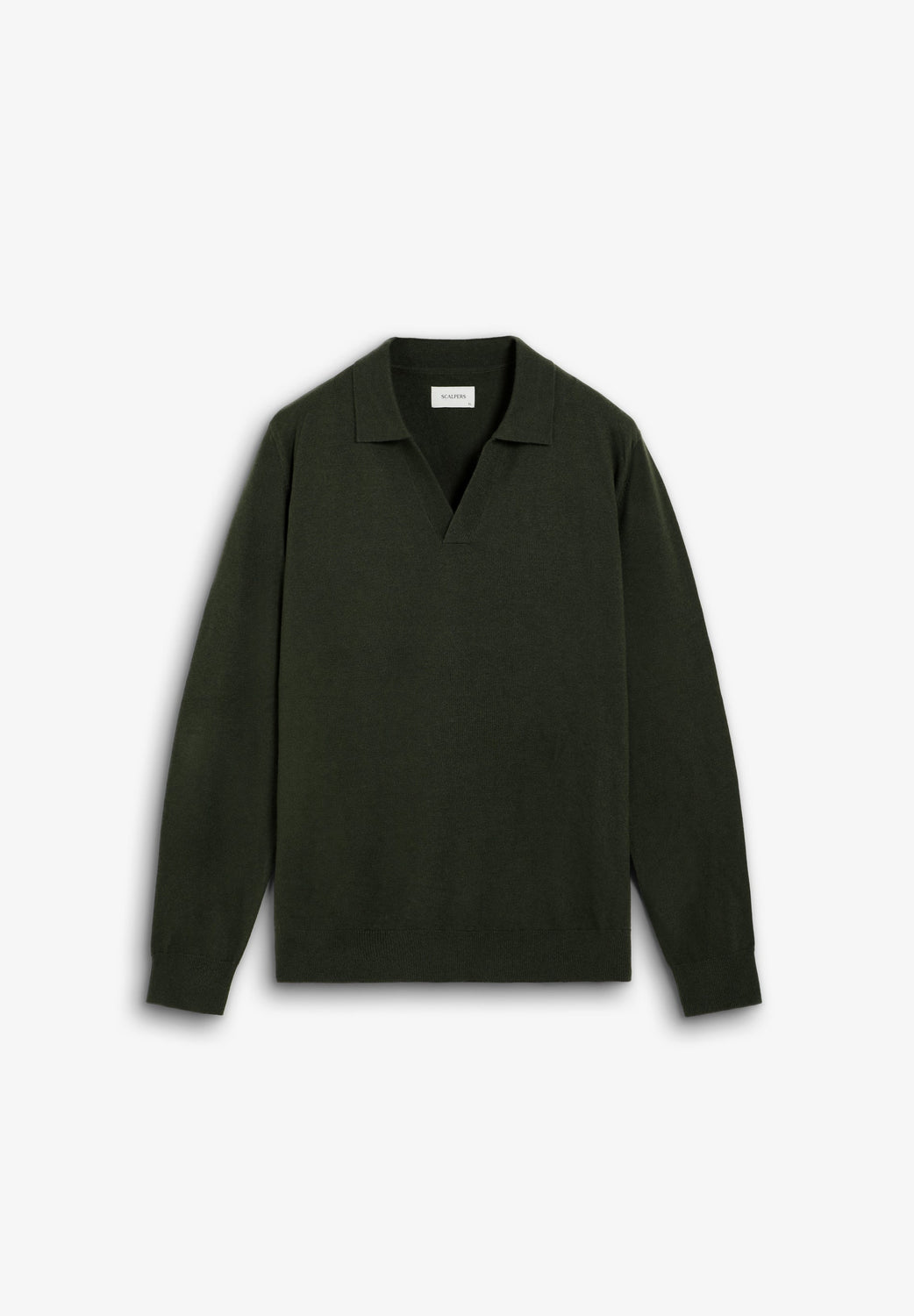 Camisa polo de malha confecionada em lã. Manga comprida. Acabamentos em nervuras. Decote em V.