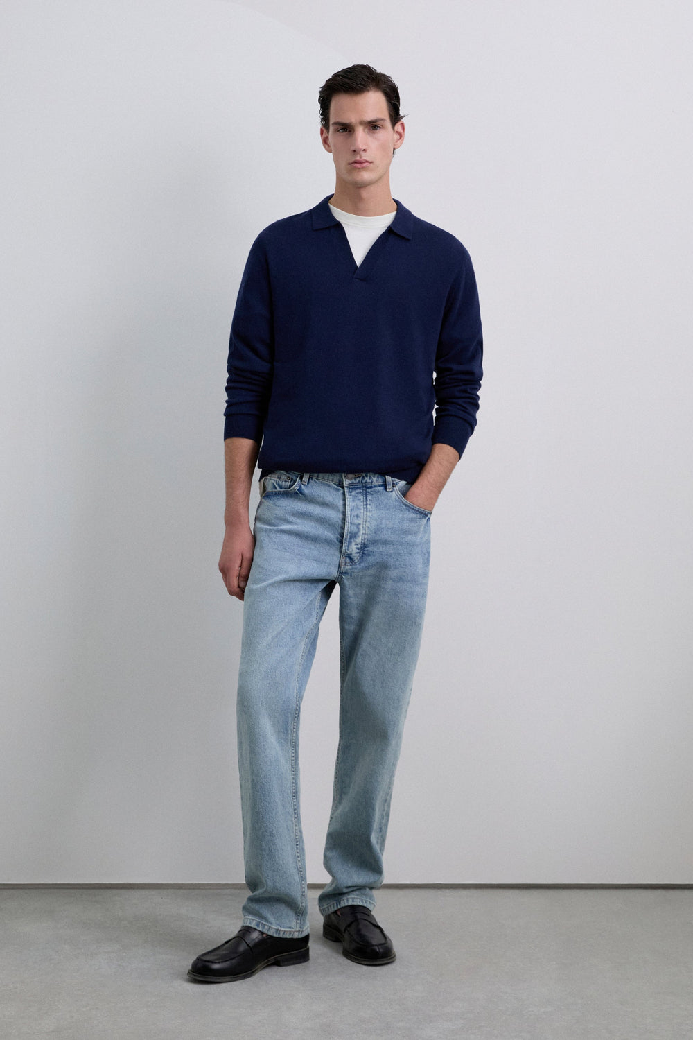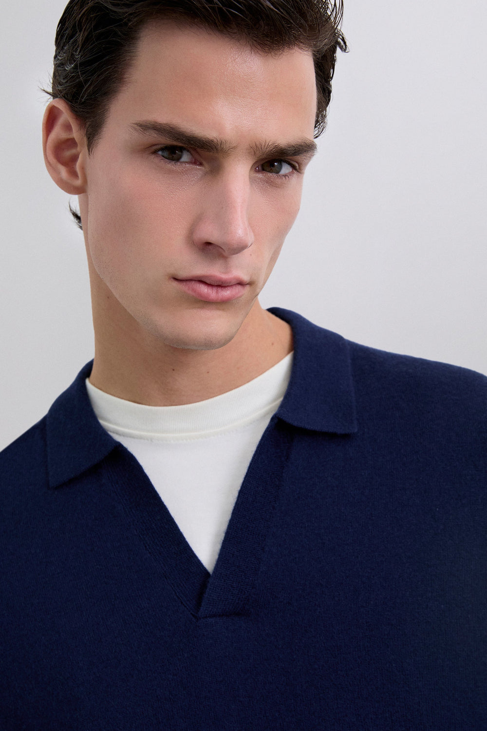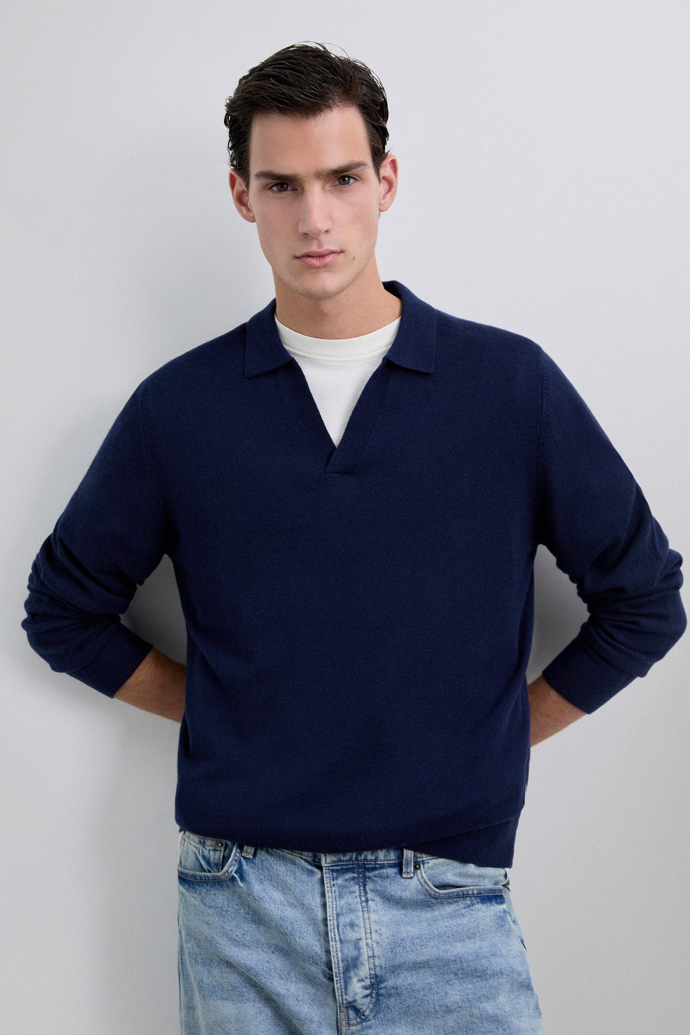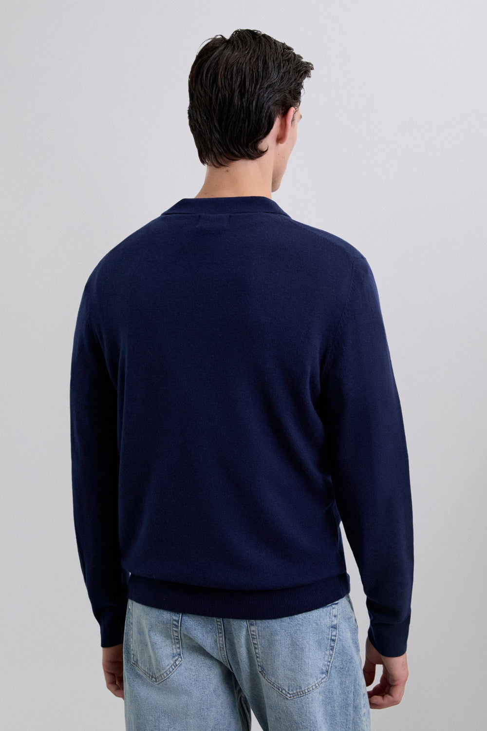 Camisa polo de malha confecionada em lã. Manga comprida. Acabamentos em nervuras. Decote em V.