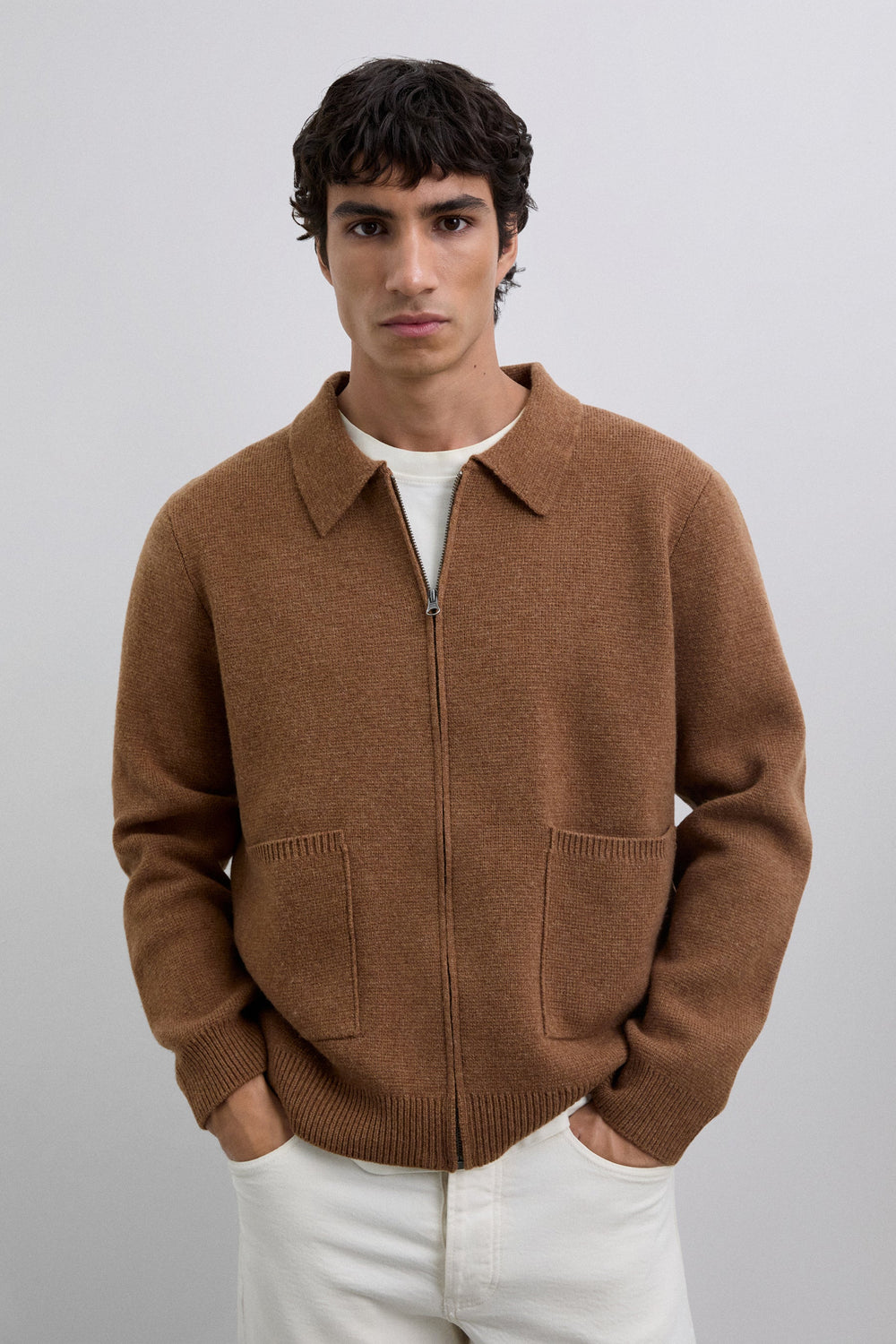Cardigan confecionada em 100% lã merino. Fecho de correr. Bolsos frontais. Manga comprida. Regular fit. Acabamentos em nervuras.
