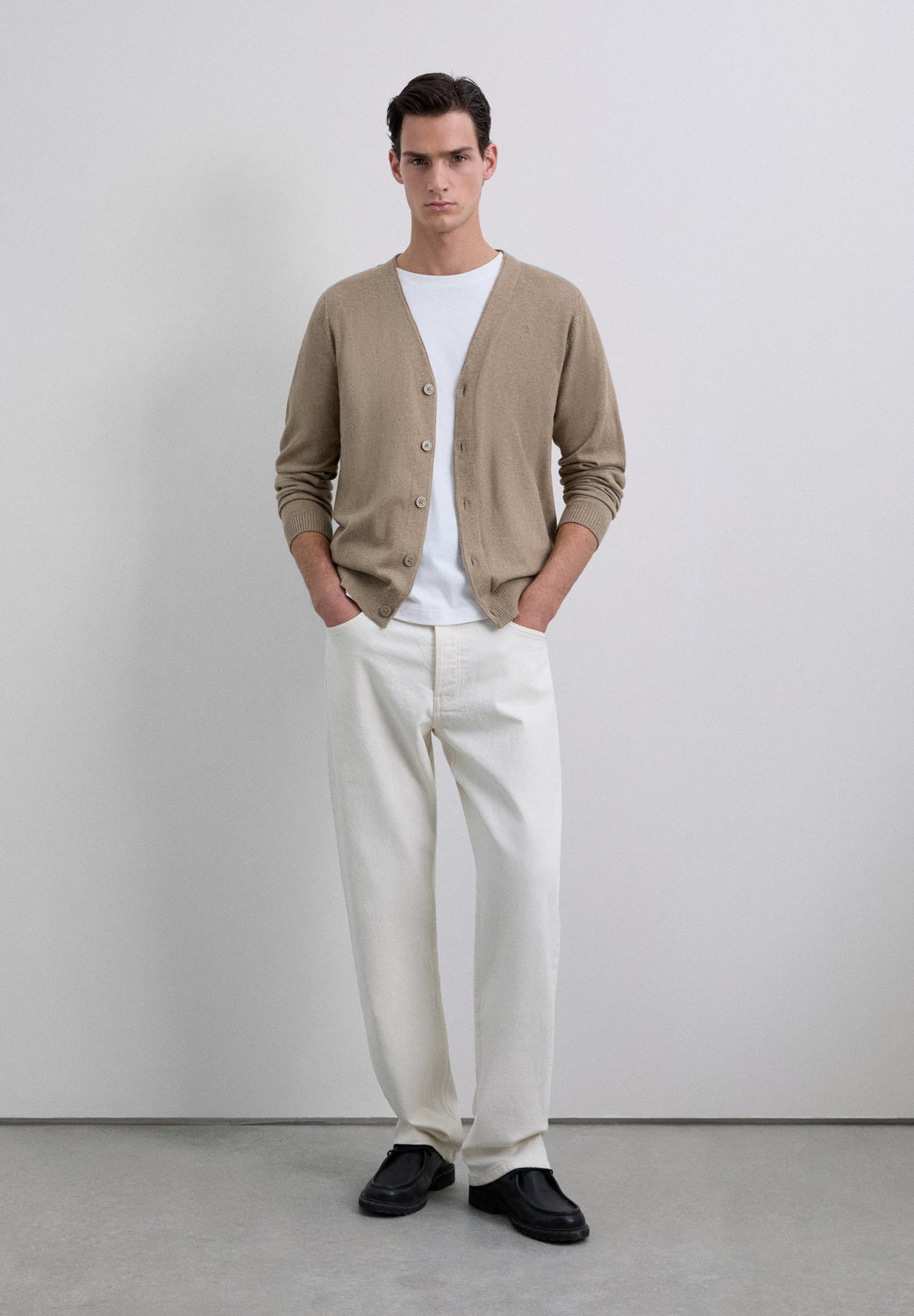Cardigan confecionado em algodão BCI. Decote em V. Fecho com botões. Manga comprida. Pormenor de skull bordada no tom no peito. Cintura e punhos acabados em nervuras.