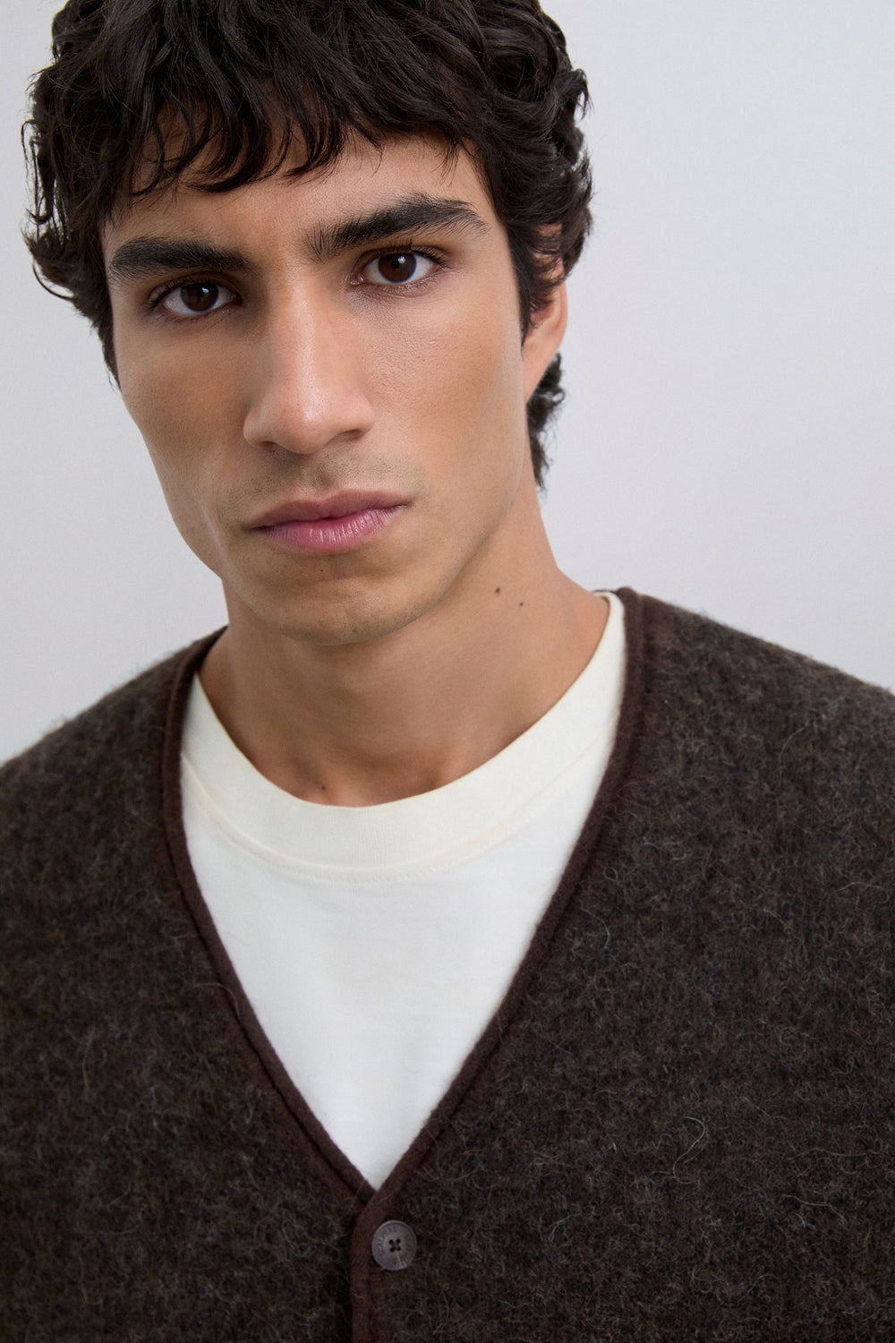 Cardigan confecionado em alpaca. Decote em V. Manga comprida. Fecho frontal com botões. Dois bolsos à frente. Pormenor de etiqueta com logótipo no interior.