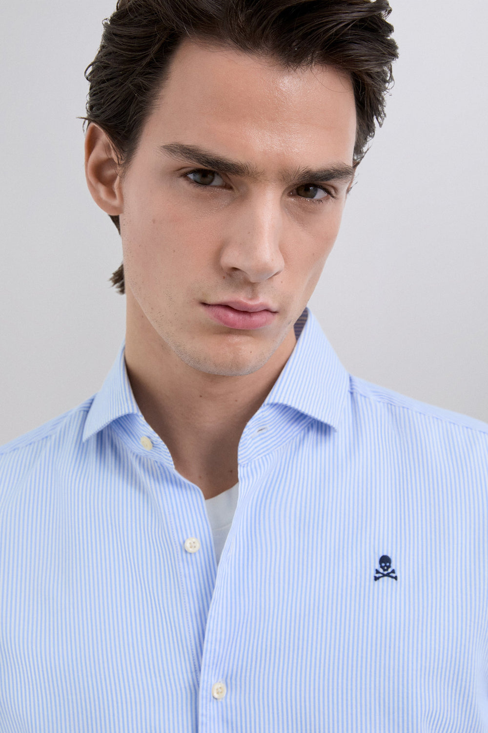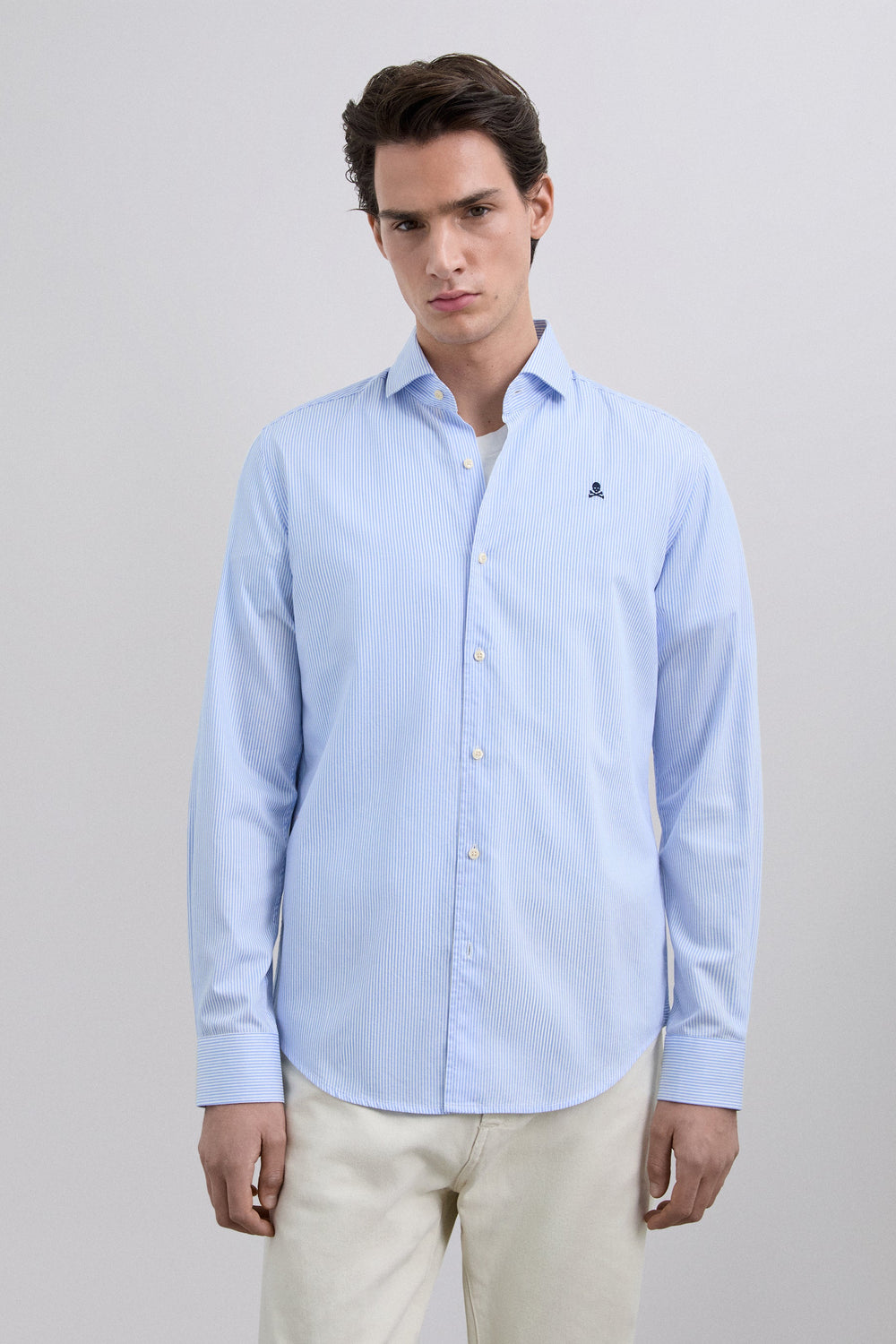 Camisa confecionada em tecido 100% algodão BCI. Regular fit. Manga comprida. Padrão às riscas. Fecho frontal e no punho com abotoadura. Pormenor de skull bordada em contraste no peito.
