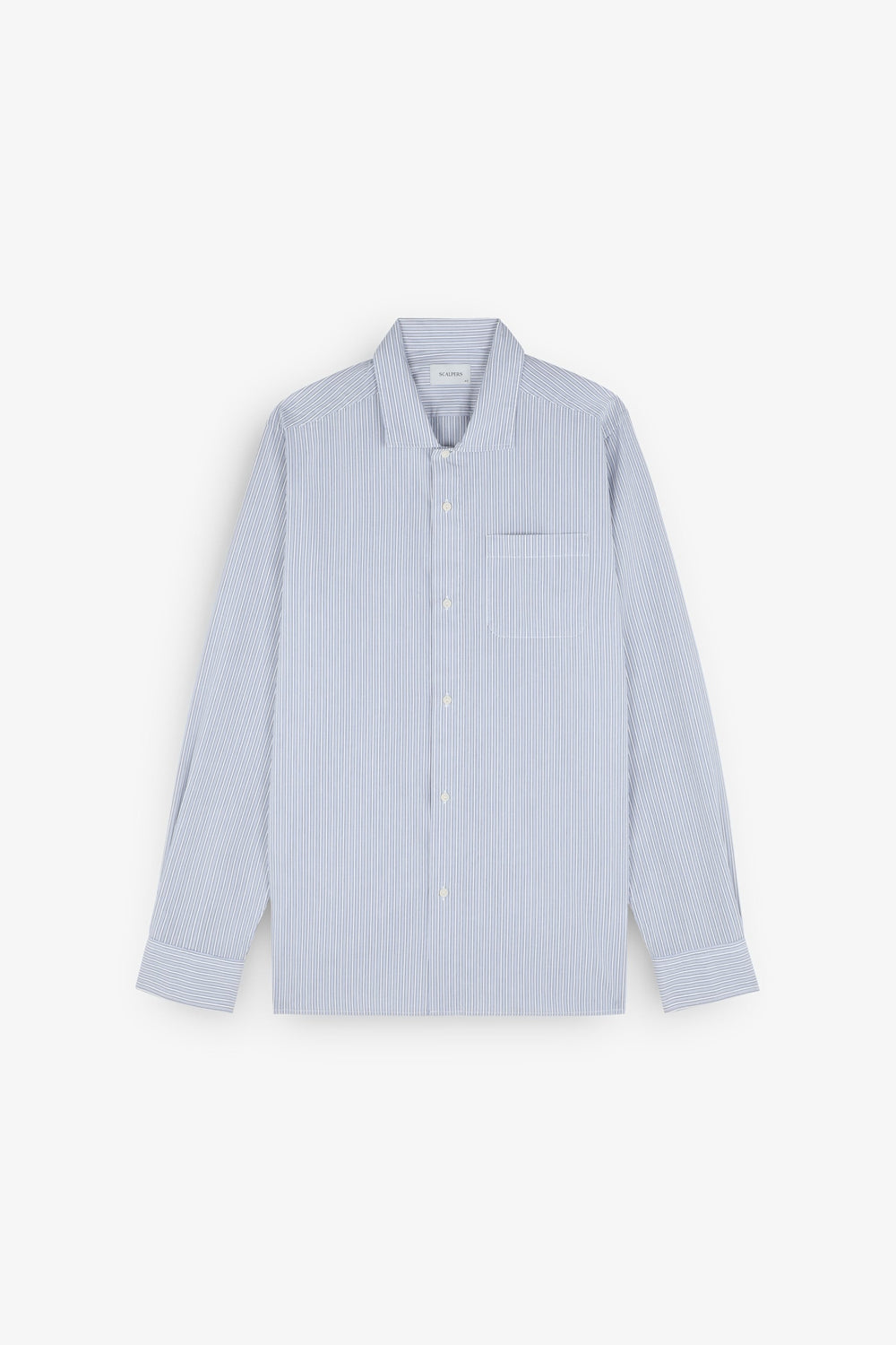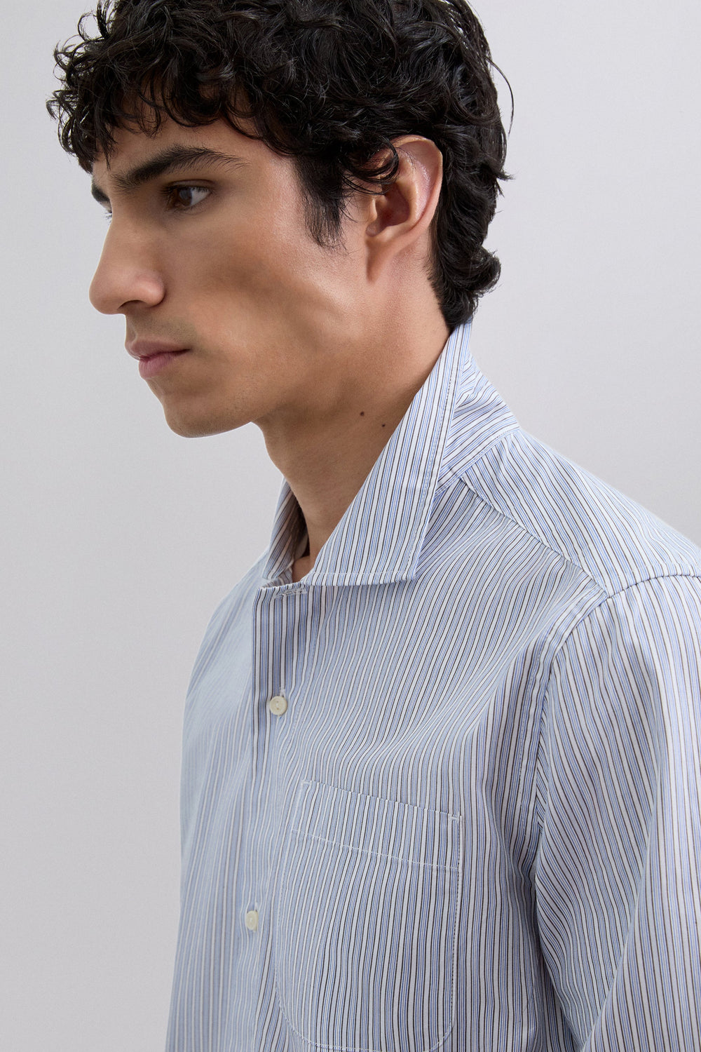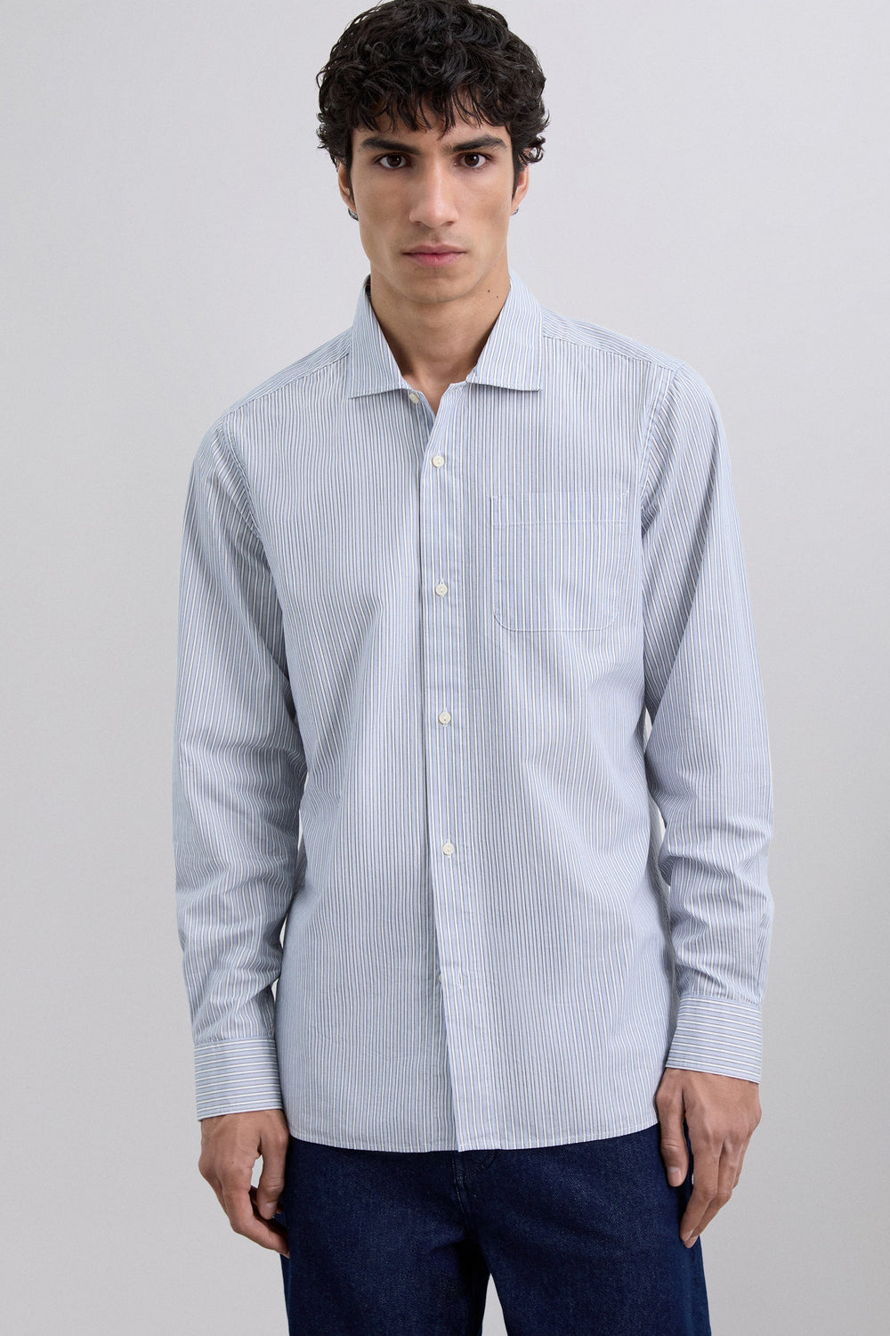 Camisa confecionada em tecido 100% algodão BCI. Manga comprida. Padrão às riscas. Bolso frontal no peito. Pormenor de skull bordada em contraste no punho.