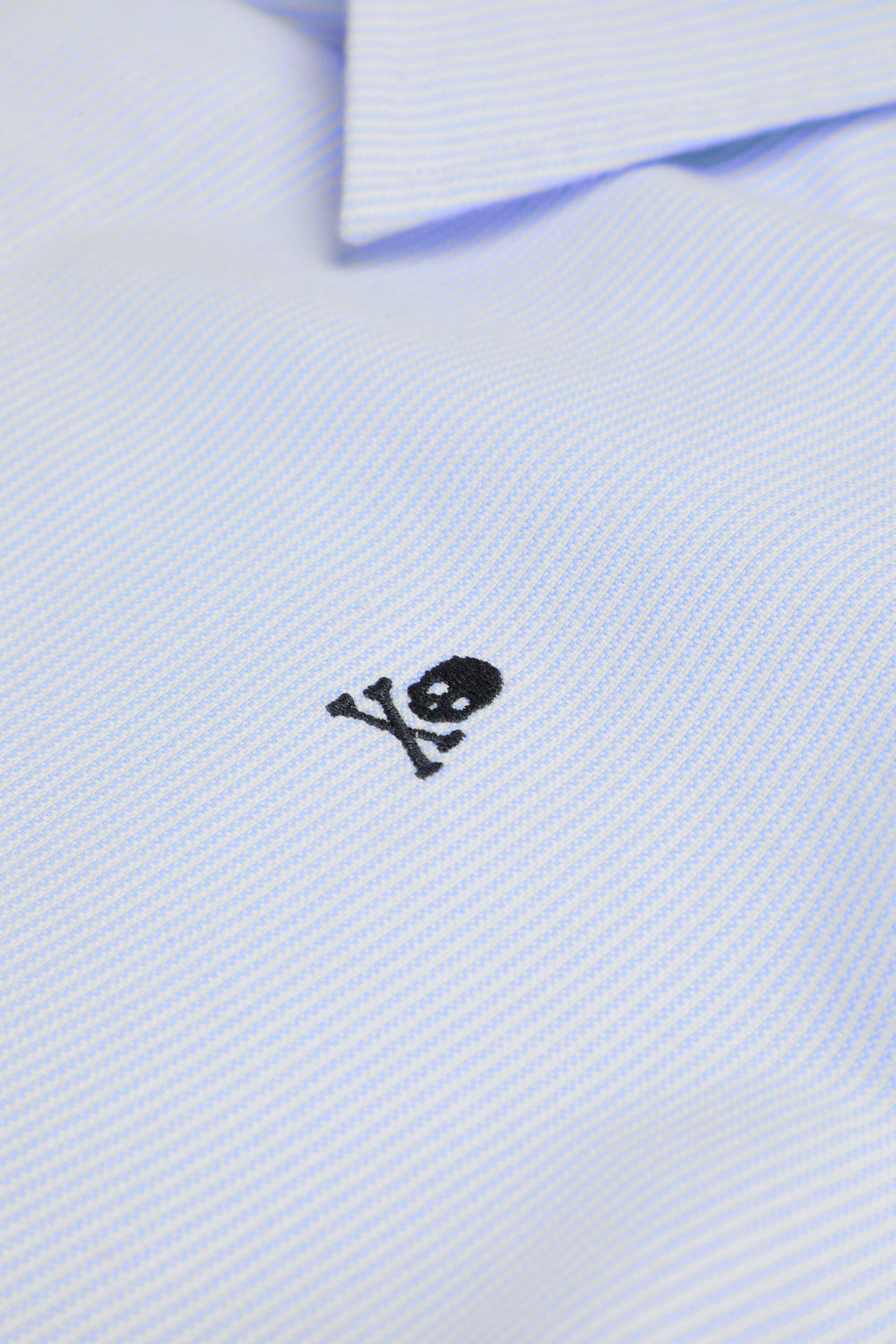 Camisa confecionada em tecido 100% algodão. Padrão às riscas. Corte regular, colarinho italiano e fecho de botões. Manga comprida com punhos abotoados. Skull bordada em contraste no peito.