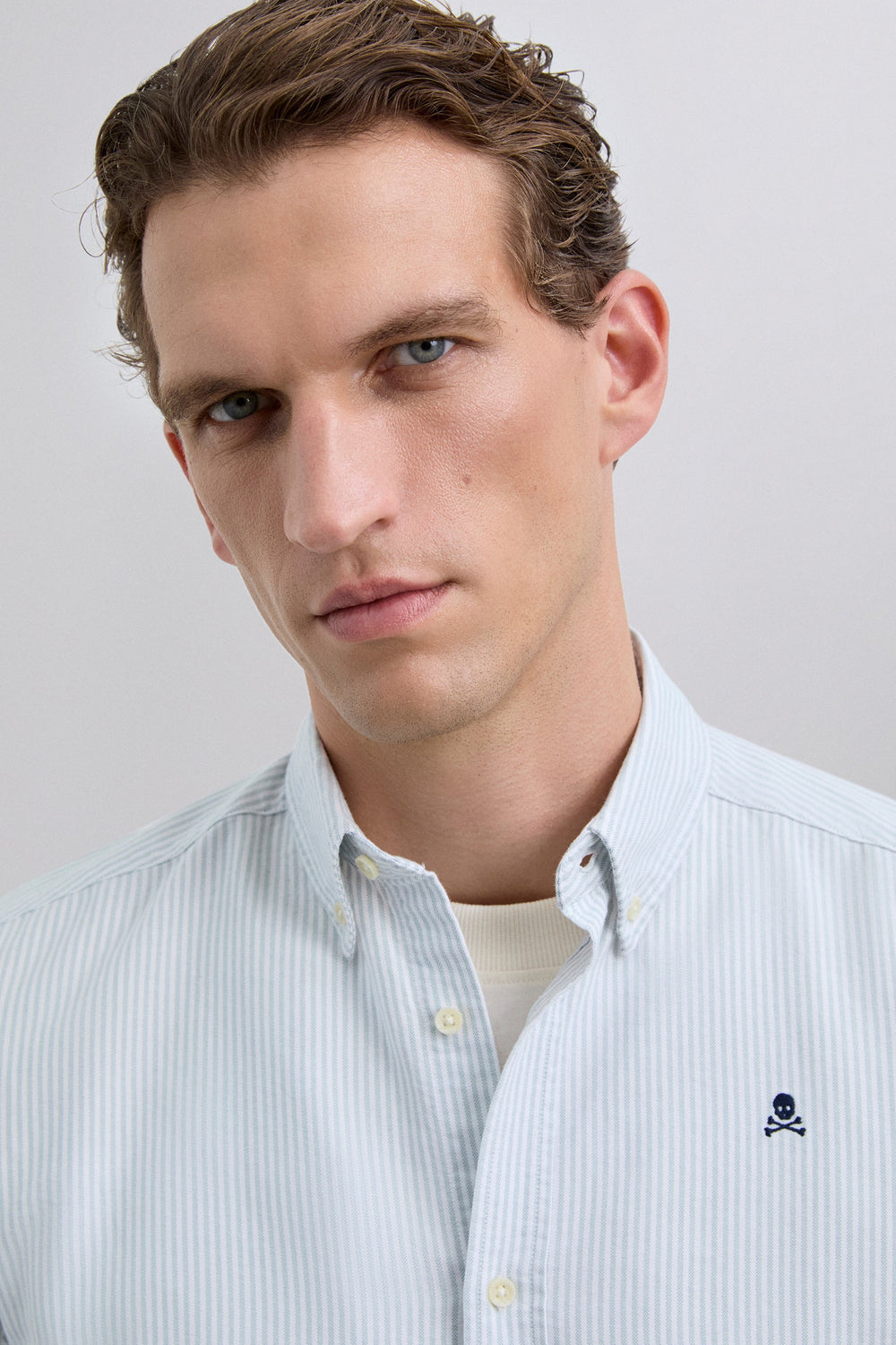 Camisa Oxford confecionada em 100% algodão BCI. Fecho de abotoadura, Padrão às riscas. Manga comprida com fecho de botão. Pormenor de skull bordada em contraste no peito