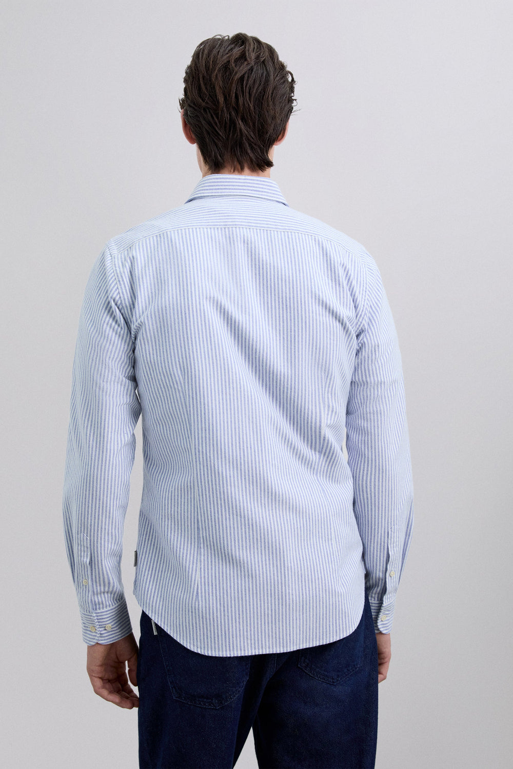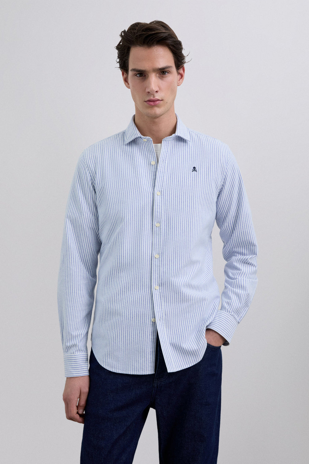 Camisa Oxford confecionada em 100% algodão BCI. Regular fit. Padrão às riscas. Manga comprida. Fecho frontal e nos punhos com abotoadura. Pormenor de skull bordada em contraste no peito.