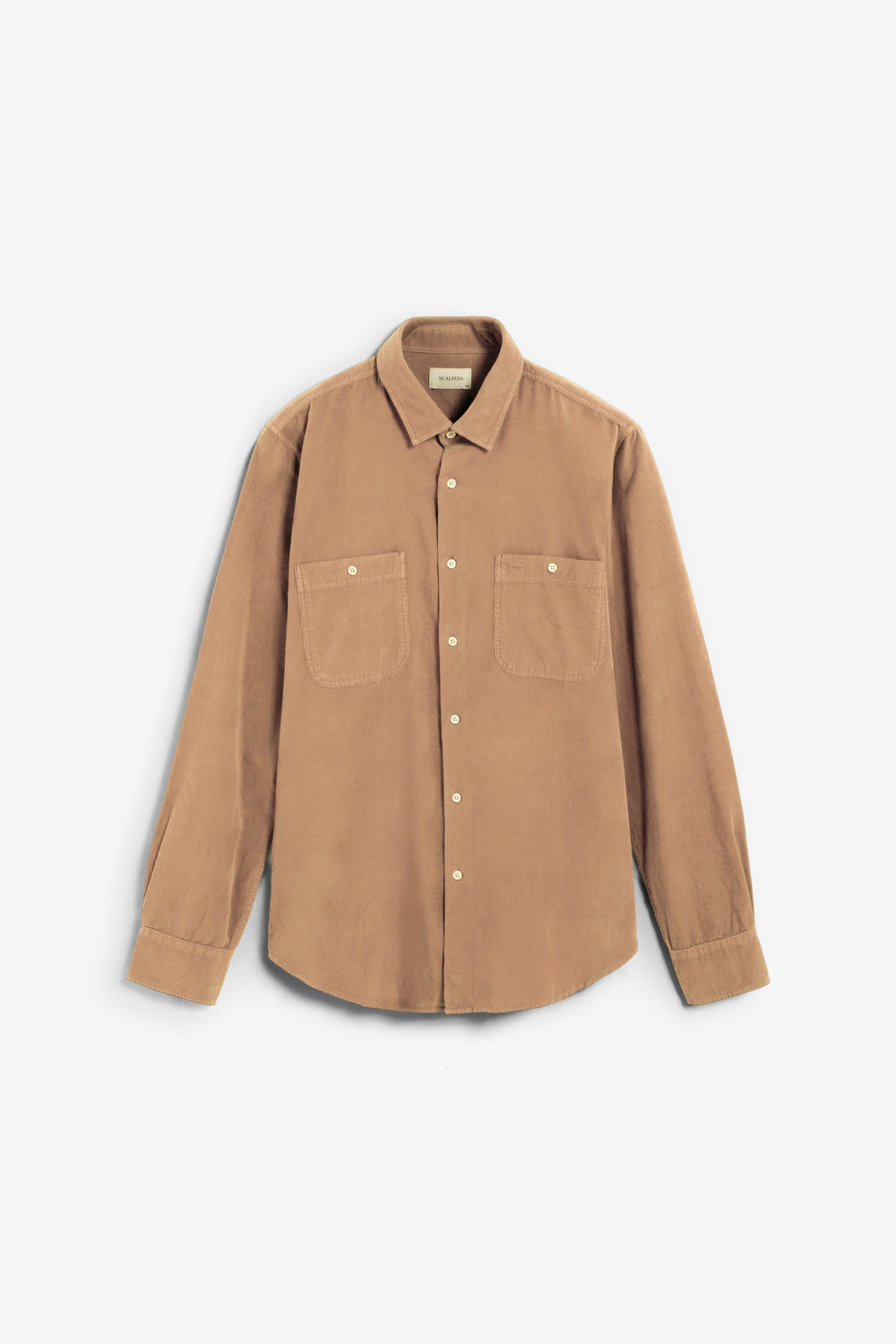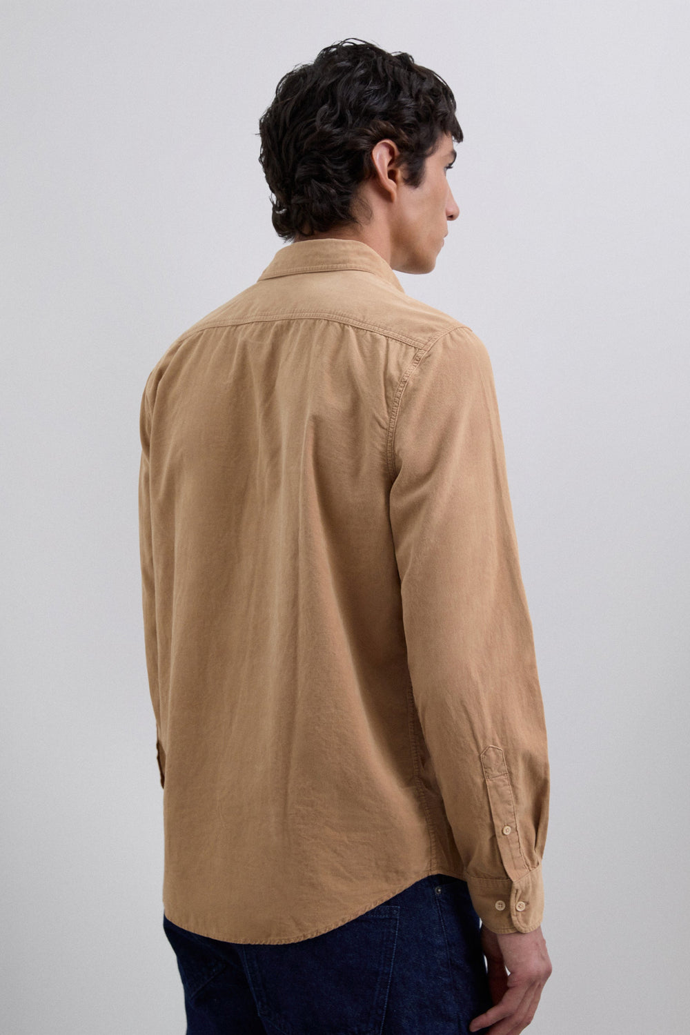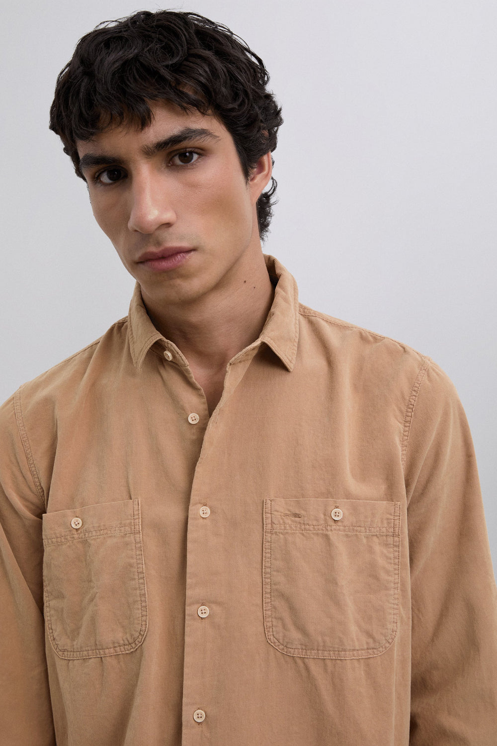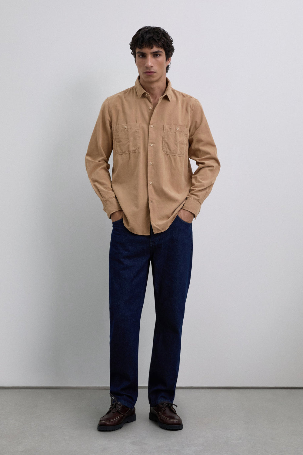 Camisa confecionada em bombazina de 100% algodão BCI. Regular fit. Manga comprida acabada em punho com botão. Bolsos de chapa no peito. Fecho à frente com abotoadura.