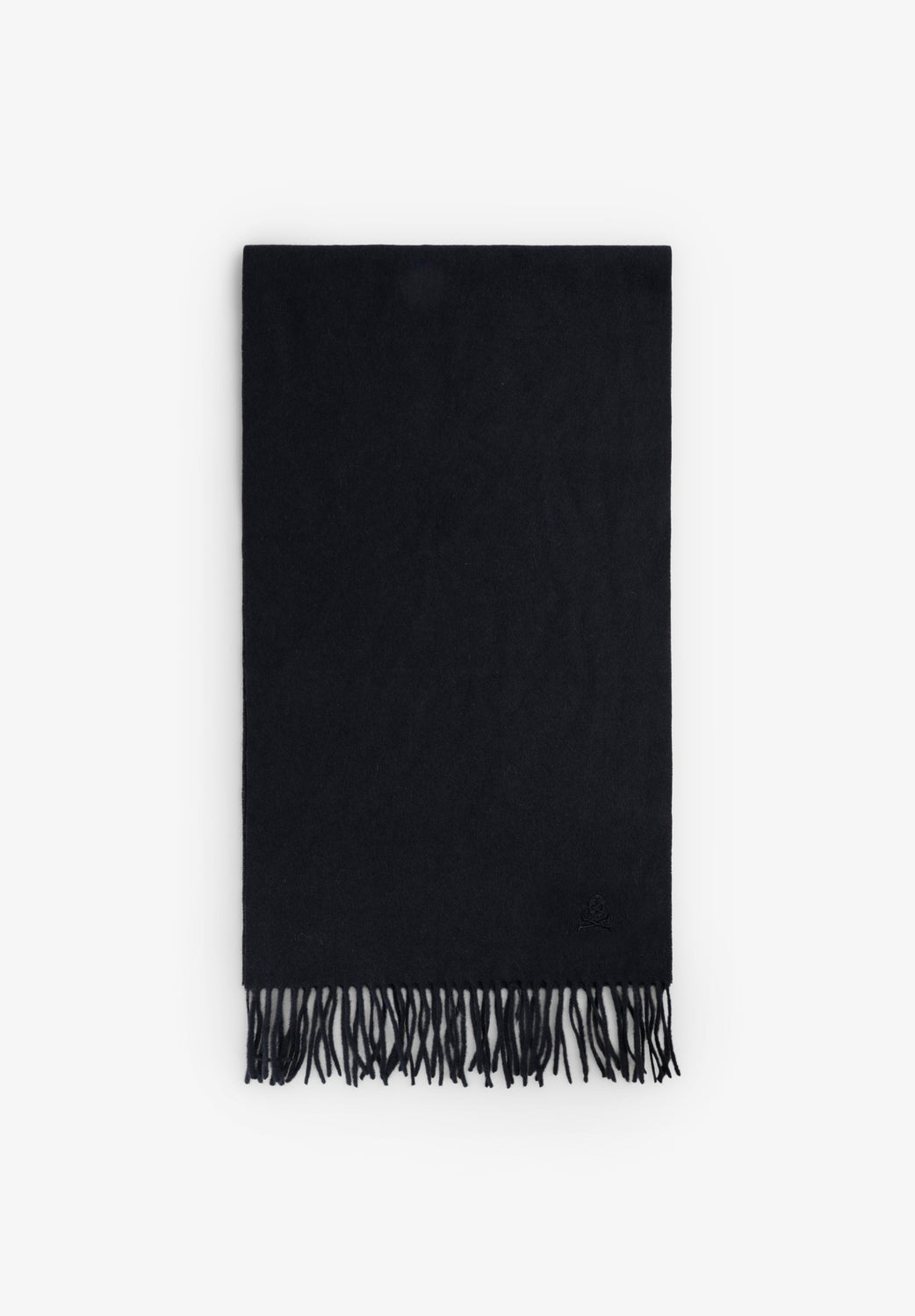 Cachecol confecionado em 100% lã. Pormenor de etiqueta costurada.