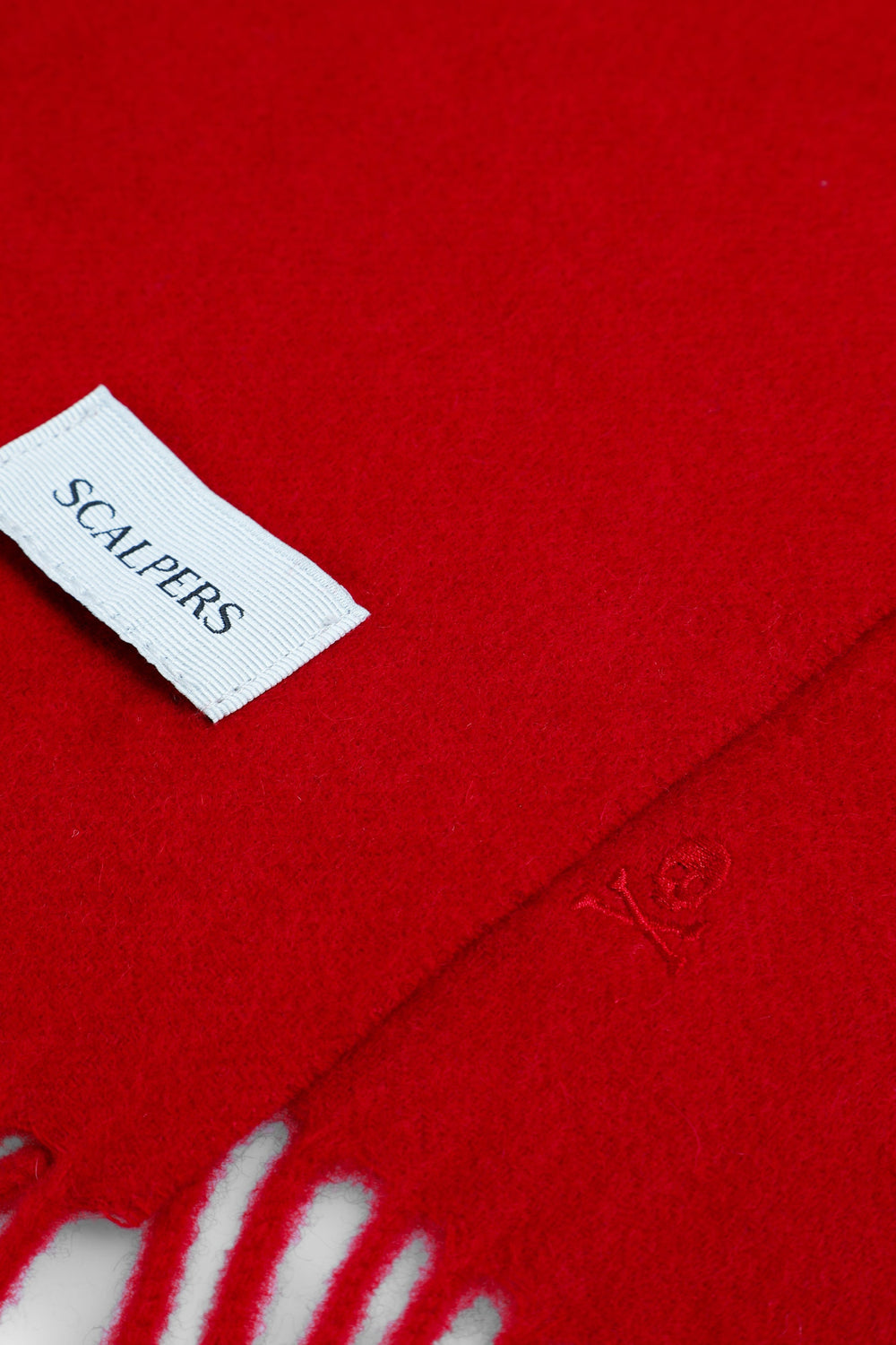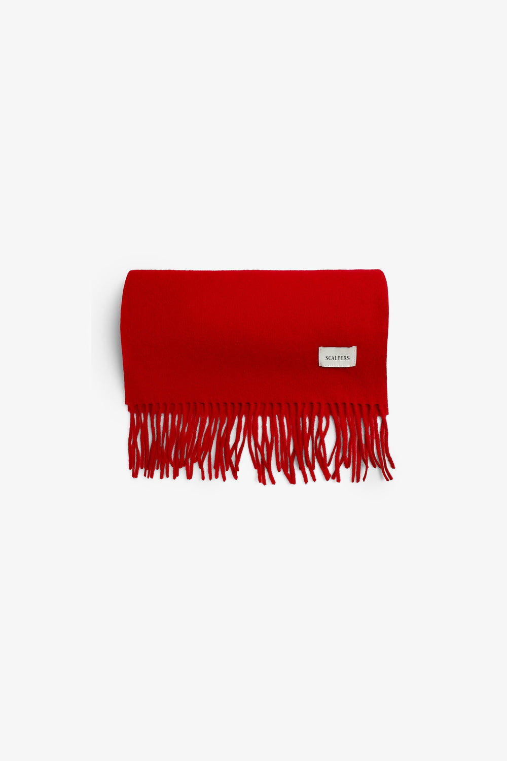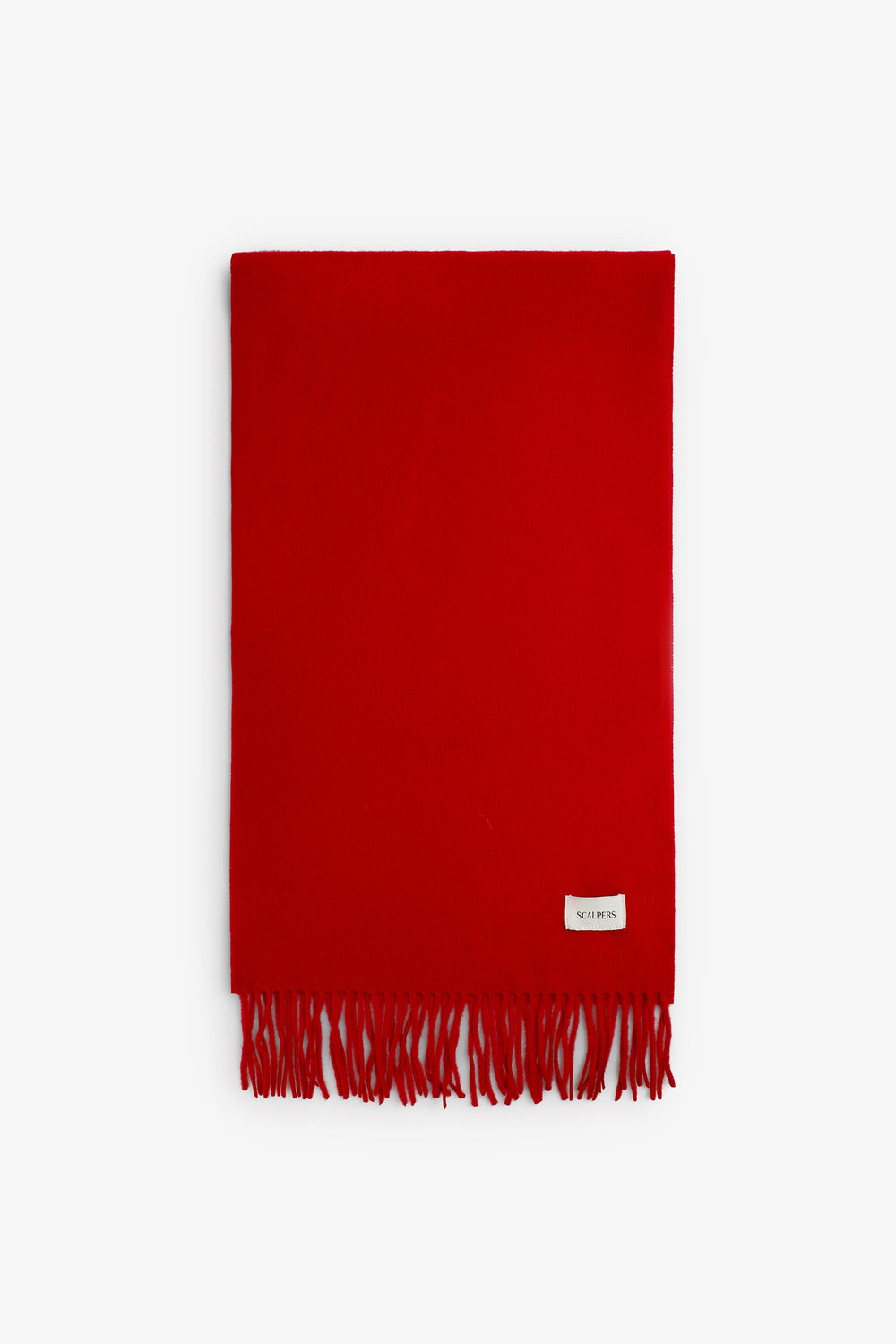 Cachecol confecionado em 100% lã. Pormenor de etiqueta costurada.