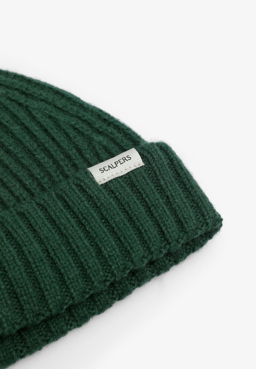 Gorro de malha canelada confecionado em mistura de lã. Pormenor de etiqueta.