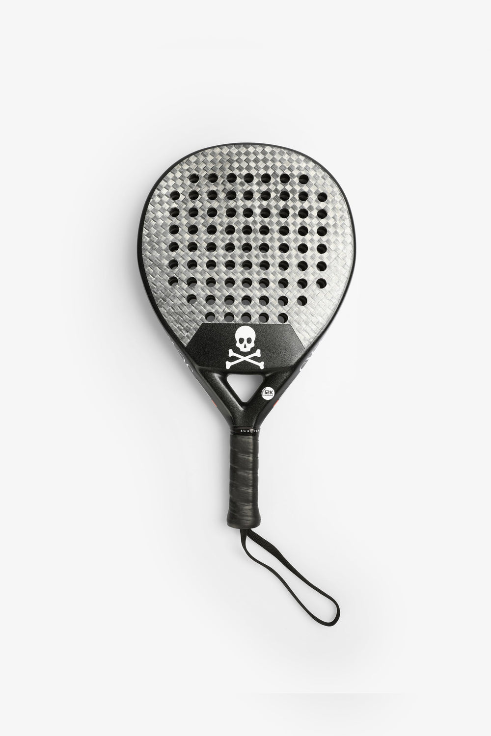 Pala de pádel confeccionada en carbono 12k aluminizado con peso de 360 gramos. Grosor de 38 mm. Forma de diamante con acabado de la superficie sand effect.