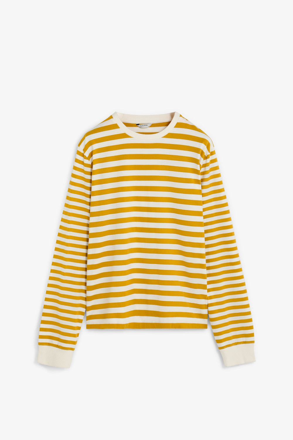 T-shirt com estampado às riscas. Confecionada em 100% algodão BCI. Corte Regular Fit. Decote redondo. Contraste na gola e nos punhos. Manga comprida.