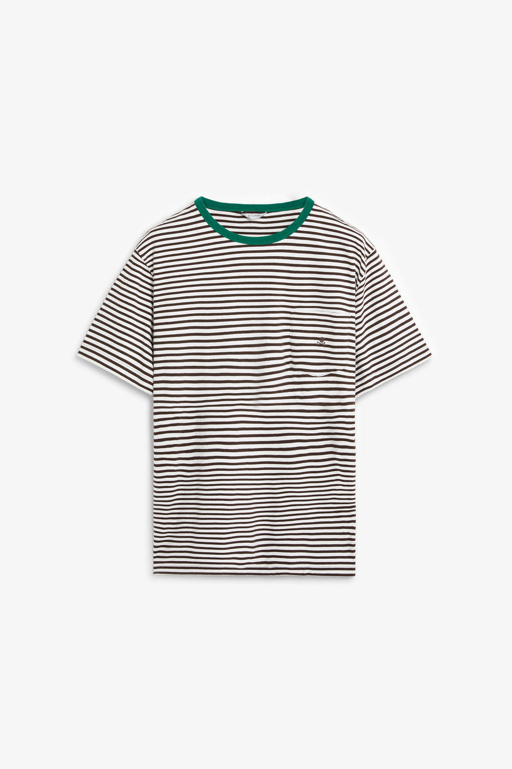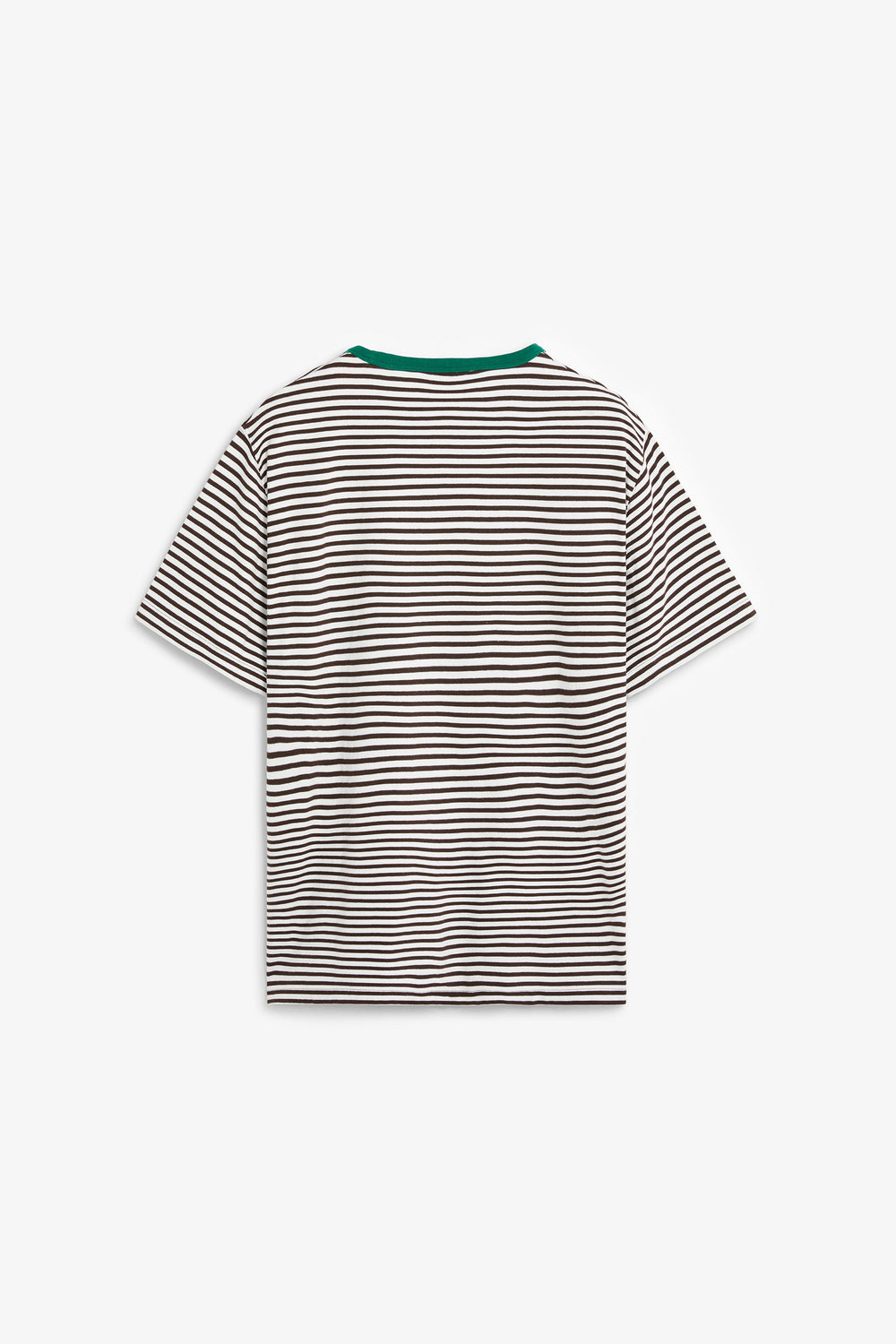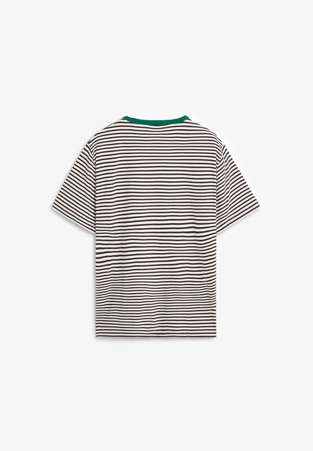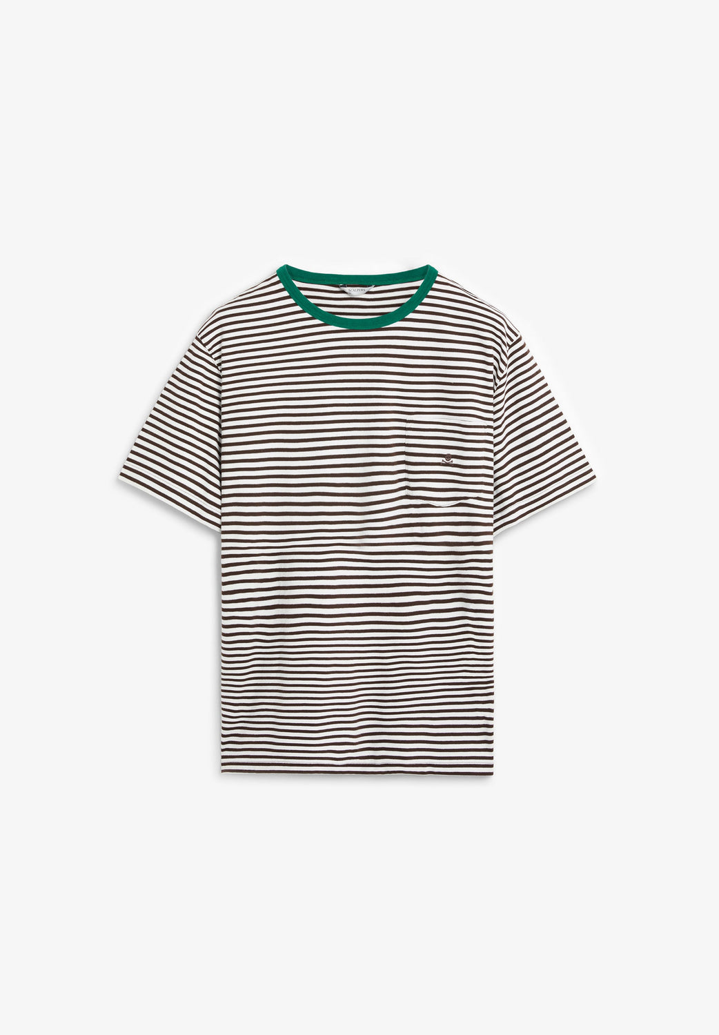 T-shirt confecionada em 100% algodão BCI. Padrão às riscas. Manga curta. Decote redondo em contraste. Pormenor de bolso no peito. Logótipo bordado.