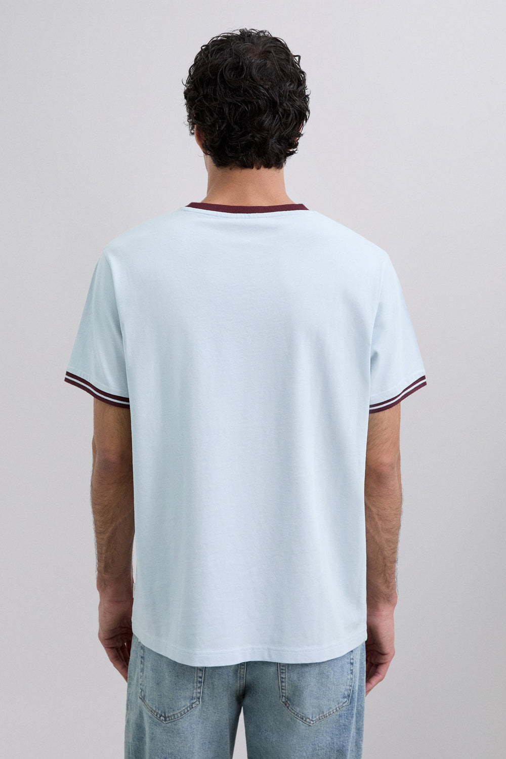 T-shirt confecionada em 100% algodão BCI. Manga curta. Padrão à frente. Corte Regular Fit. Gola e mangas com acabamento em nervuras em contraste.