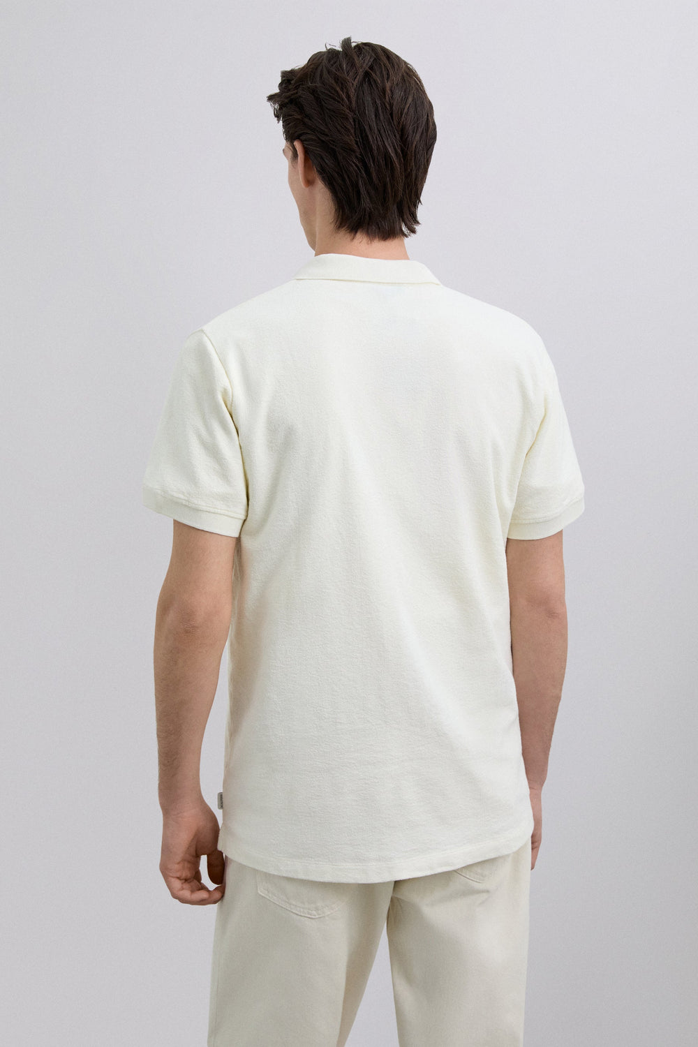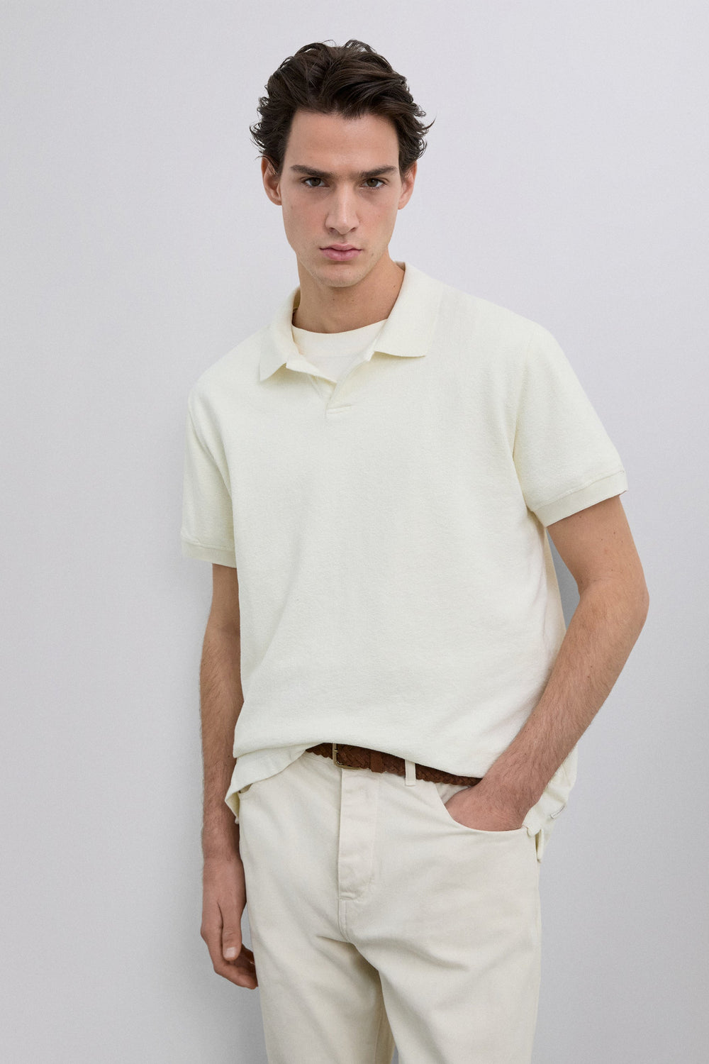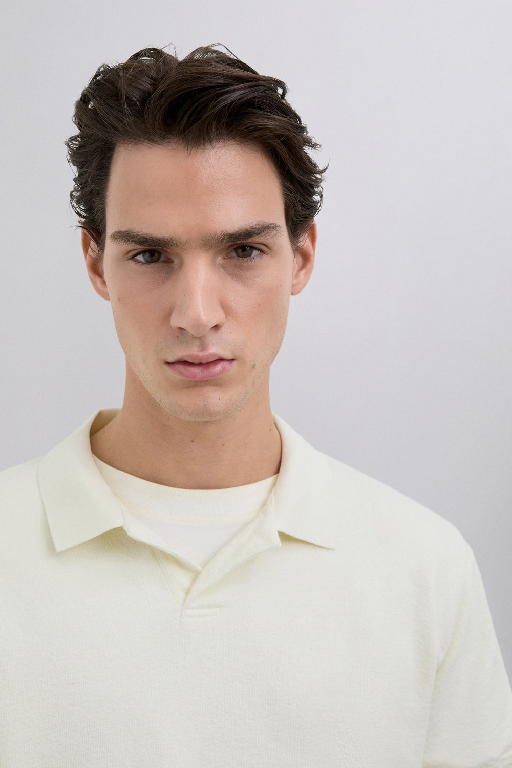 Camisa polo de manga curta em malha rústica. Corte regular. Gola aberta e punhos canelados.