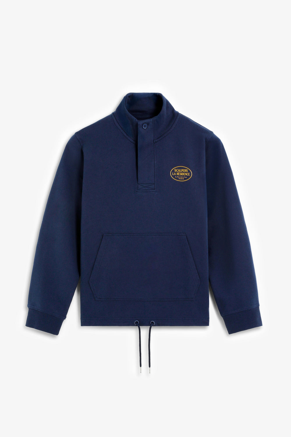 Sweatshirt confecionada em 100% algodão BCI. Manga comprida. Gola alta e fecho com botão. Padrão com logótipo no peito. Bolso à frente tipo canguru. Fecho ajustável com cordão na cintura.