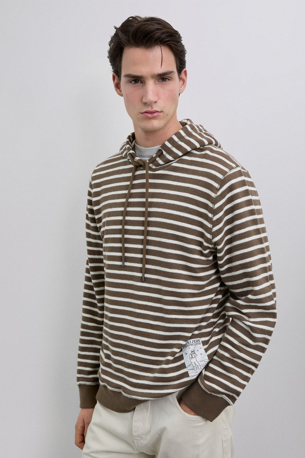 Sweatshirt confecionada em 100% algodão BCI. Padrão às riscas. Corte regular. Etiqueta bordada no lado esquerdo. Ilhós metálicos. Cordões com ponta metálica. Punhos e bainha canelados.