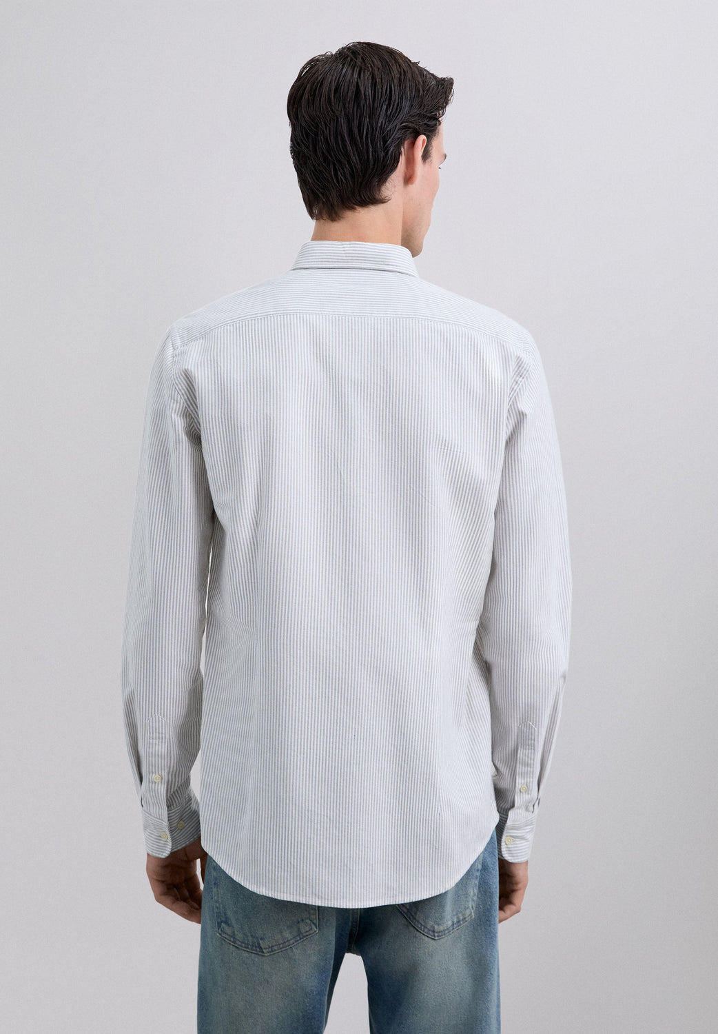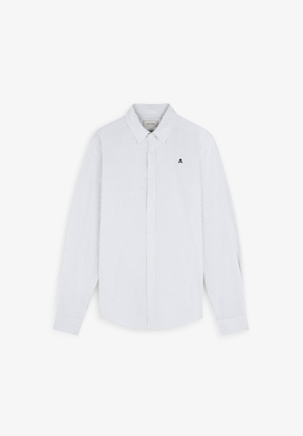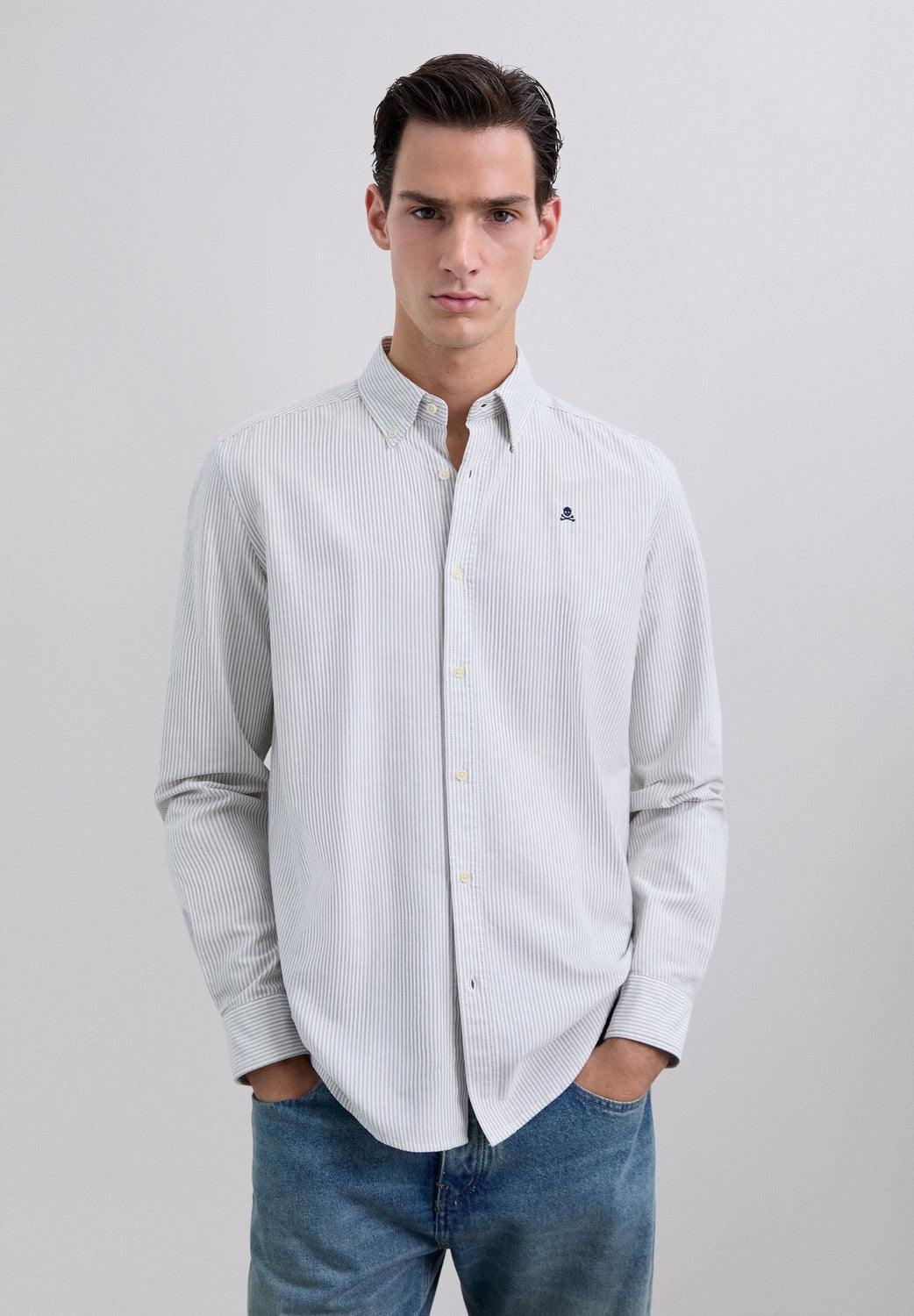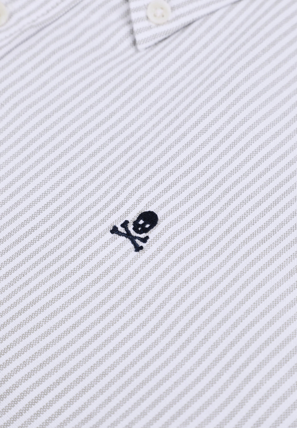 Camisa às riscas confecionada em 100% algodão BCI. Gola clássica, fecho com botões, regular fit, skull no peito em contraste. Acabamento de botões no punho.