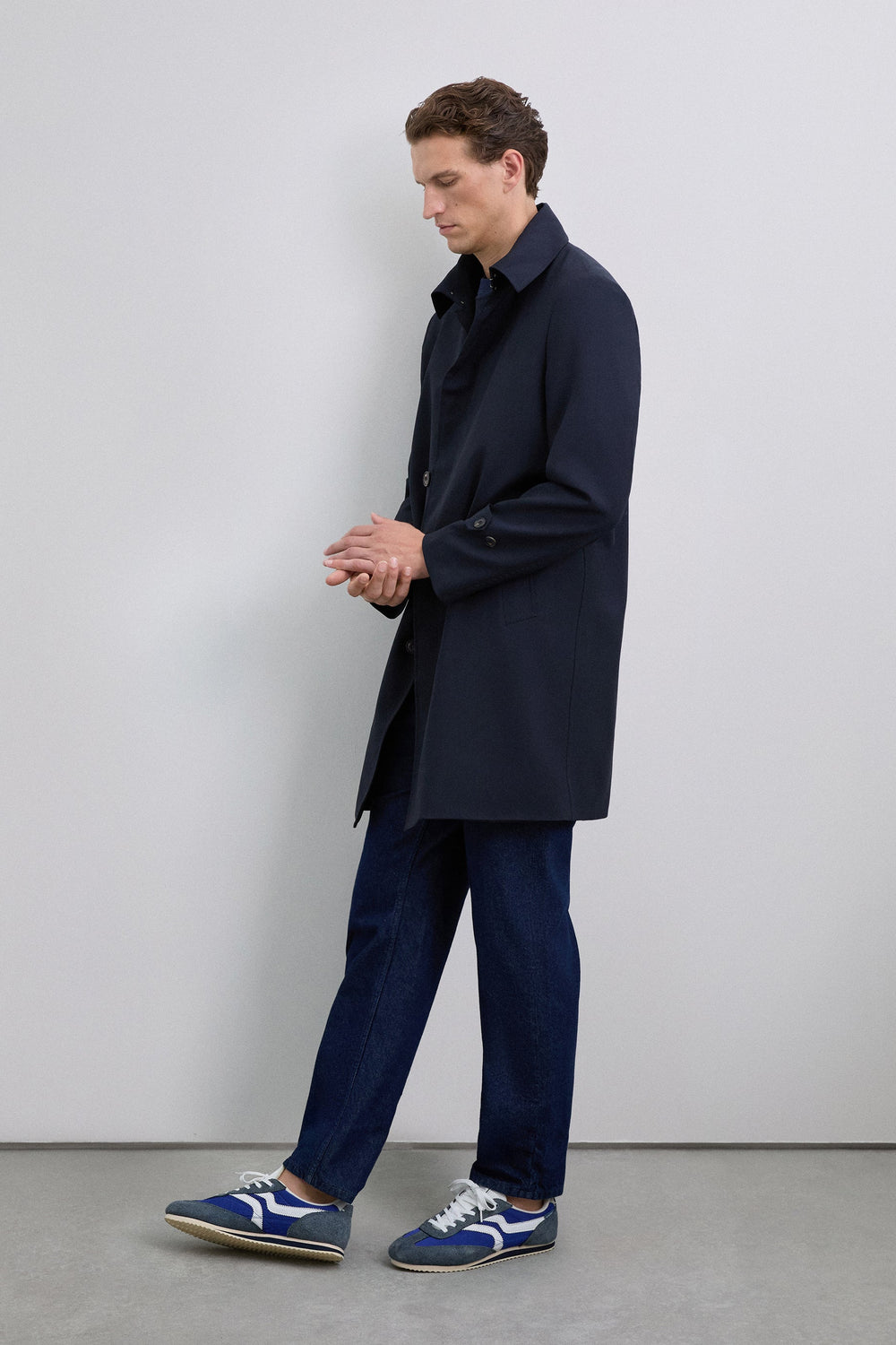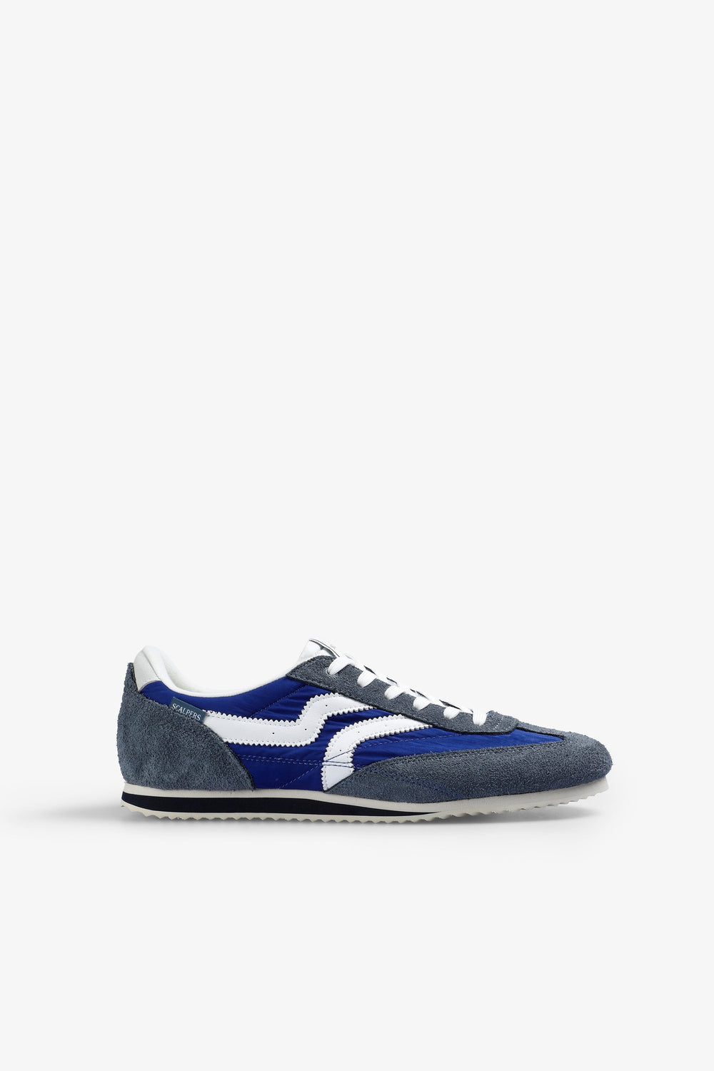 Sapatilhas de estilo rétro. Parte superior fabricada em combinação de peças em tecido técnico e pormenores em pele com acabamento em croute. Sola fina com pormenor em contraste.