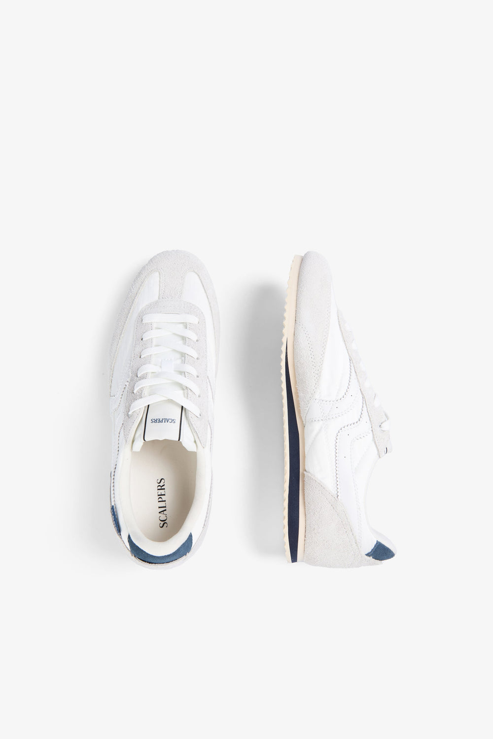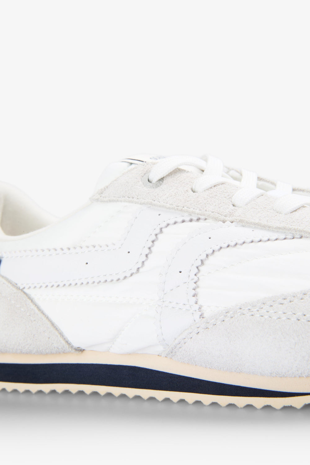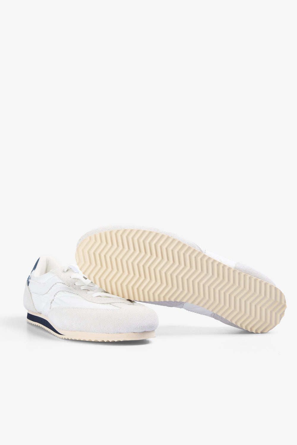 Sapatilhas de estilo rétro. Parte superior fabricada em combinação de peças em tecido técnico e pormenores em pele com acabamento em croute. Sola fina com pormenor em contraste.